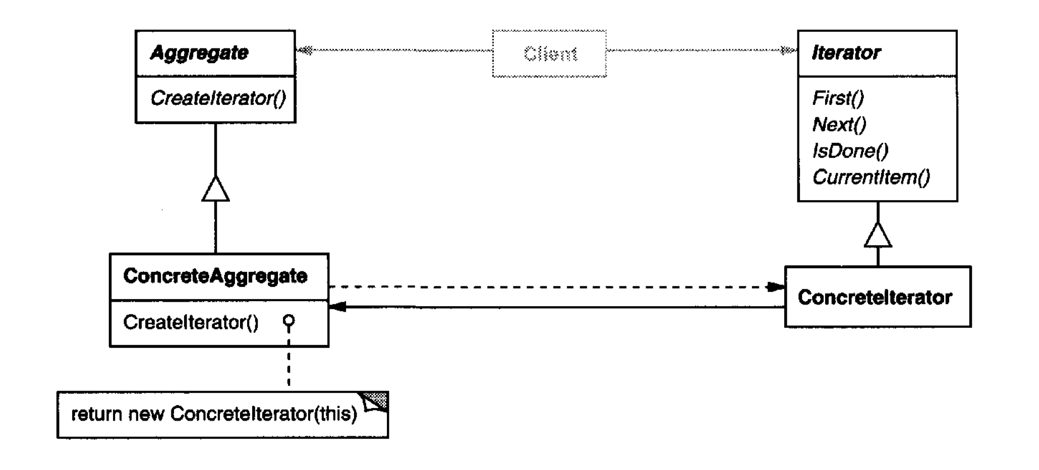 - Aggregate 인터페이스의 createIterator 메서드를 구현해 적절한 Concretelterator 인스턴스를 반환합니다.