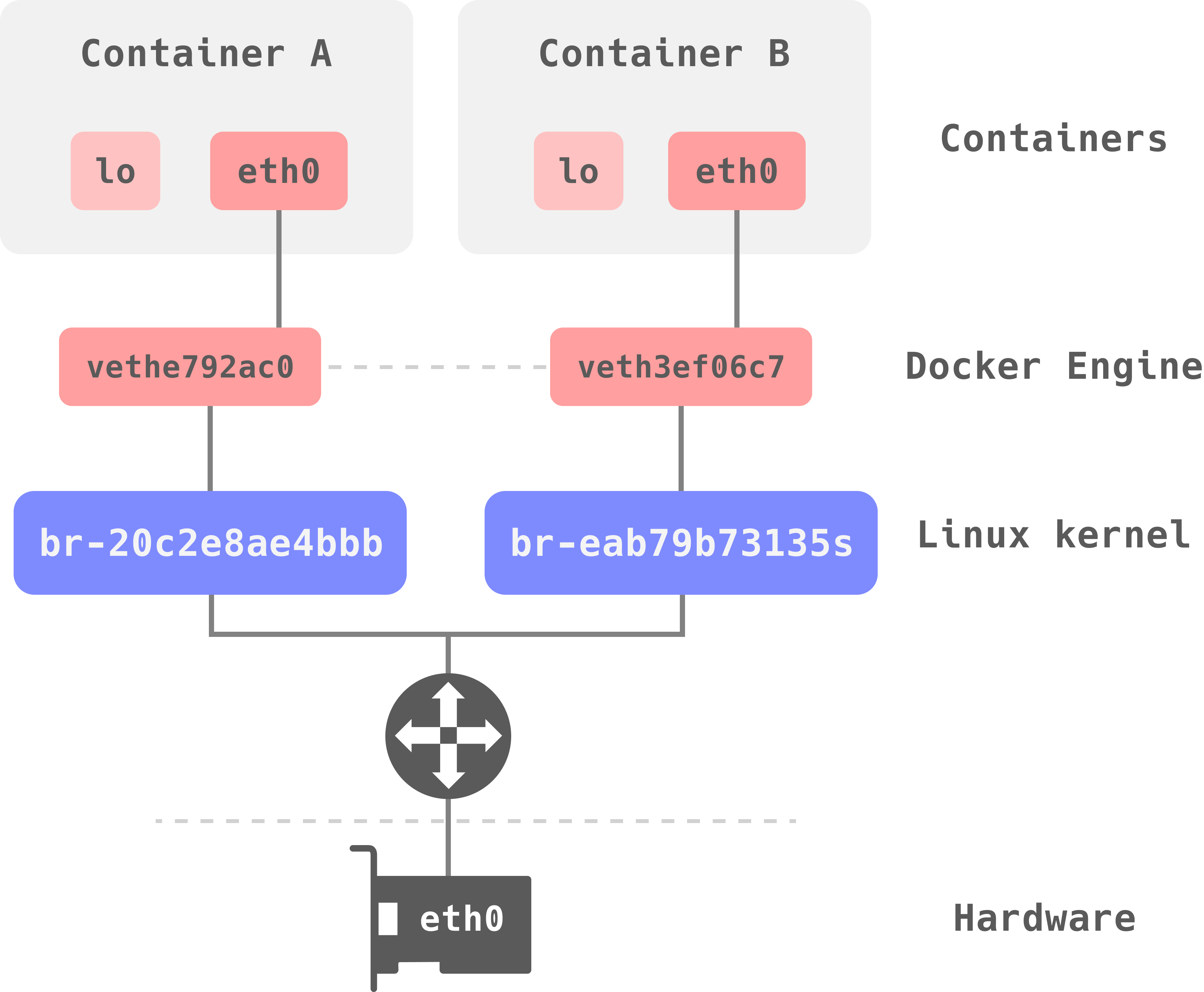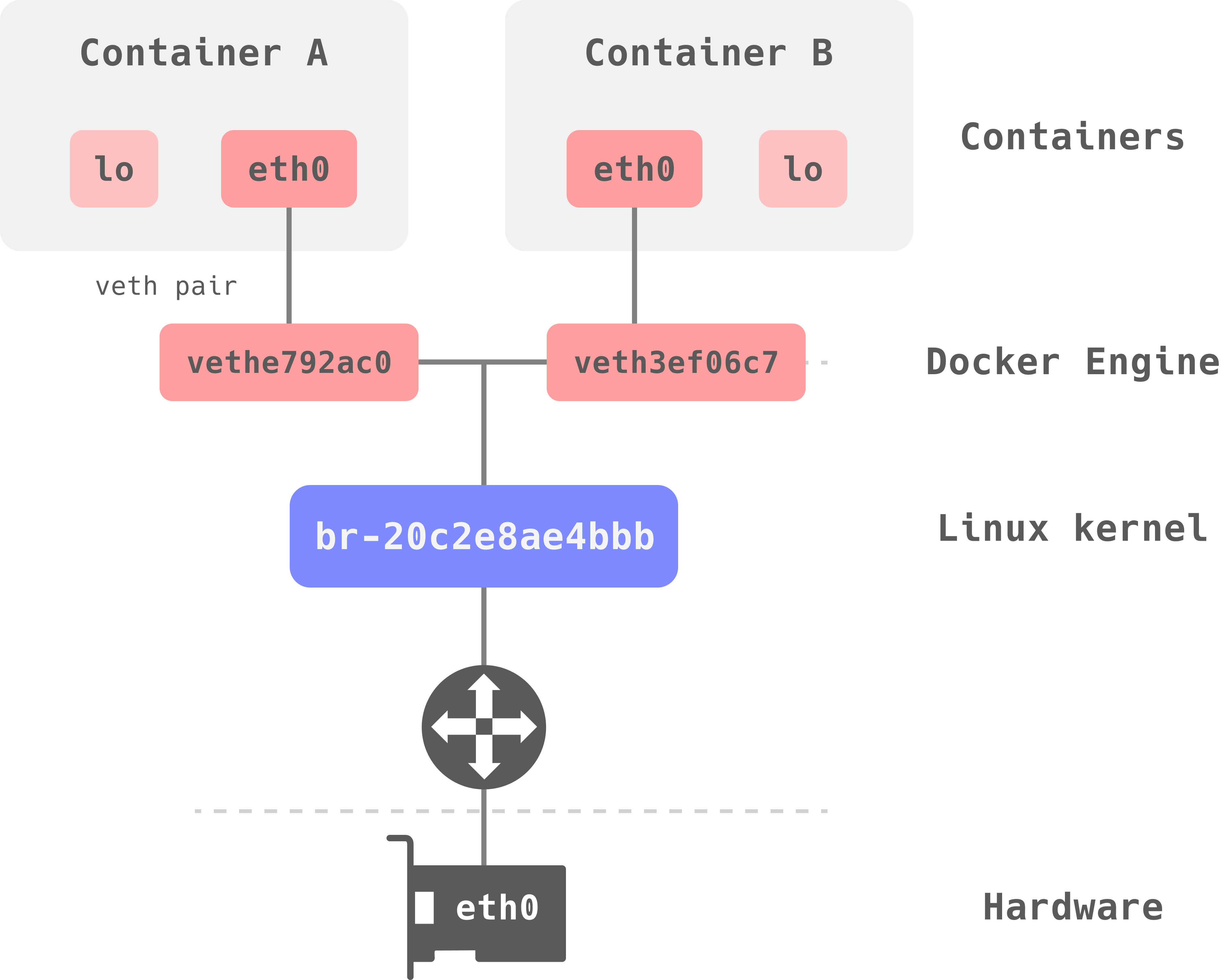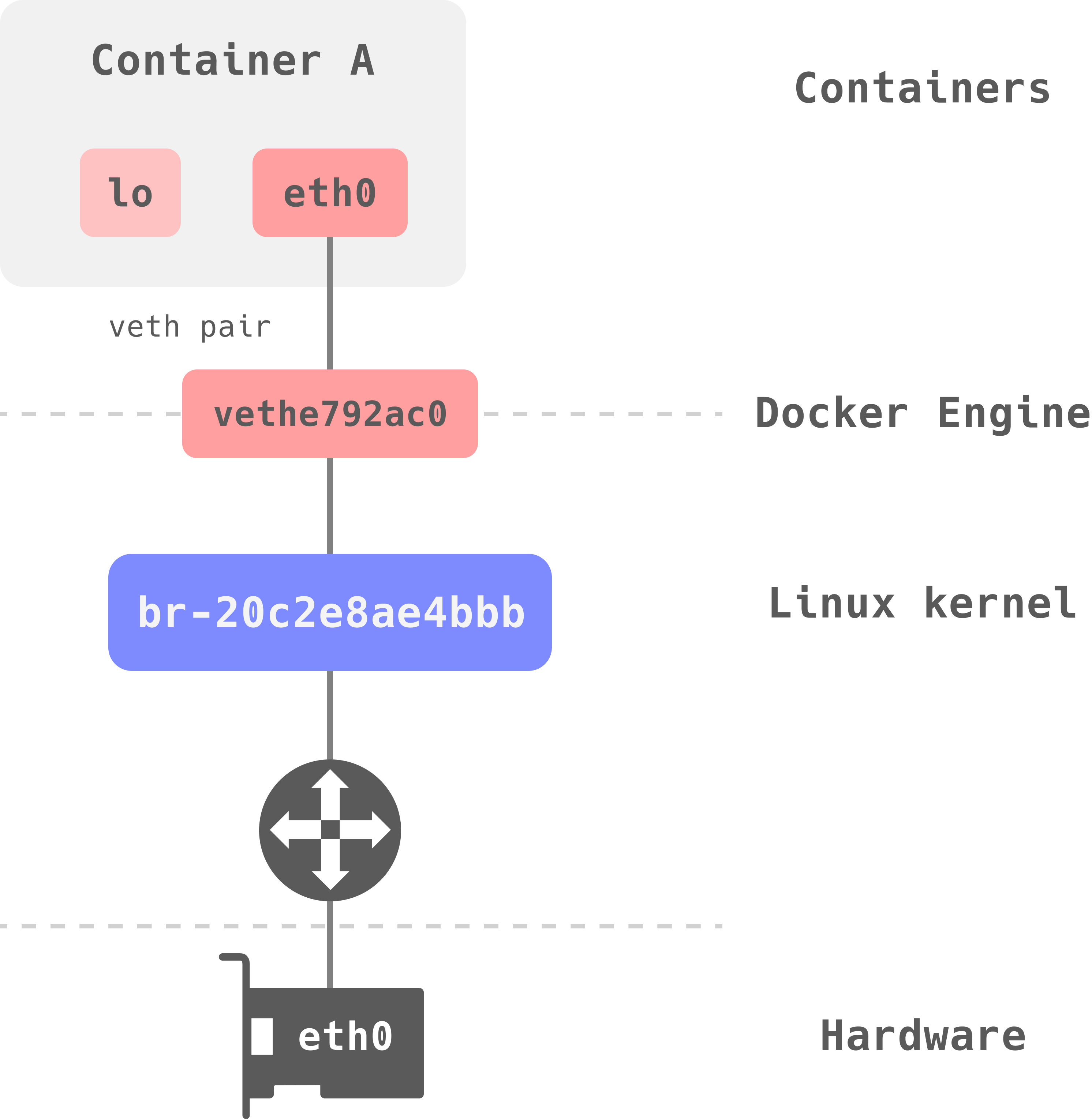ํ๋์ Bridge๋ฅผ ์์ฑํ๊ณ , ์ด๋ ํธ์คํธ์ ์ธํฐํ์ด์ค์๋ ์ฐ๊ฒฐ๋์ด์๊ธฐ ๋๋ฌธ์ ํต์ ์ ๊ฐ๋ฅํ๊ฒ ํด์ค๋๋ค.
