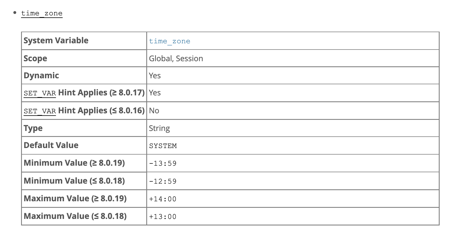 아래는 mysql 공식 문서에서 명시하고 있는 time_zone 변수 스펙입니다.