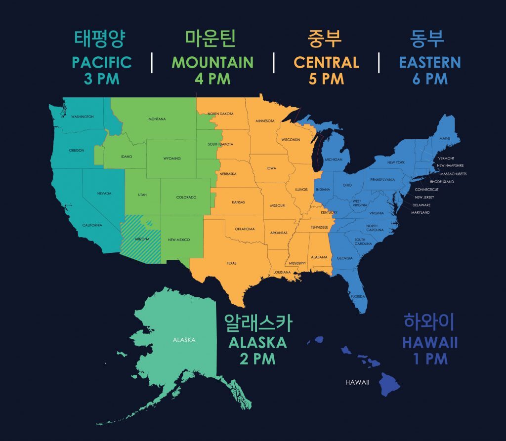 미국은 지륙이 크기 때문에 아래와 같이 여러 개의 시간대로 나누고 있습니다.