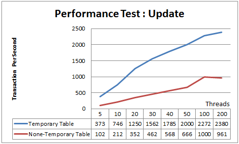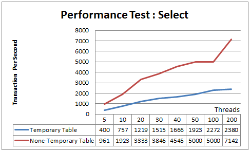 위의 그래프는 Temporary Table과 Non-Temporary Table의 Select / Update 문의 성능 차이를 테스트한 결과를 아주 잘 보여줍니다. Threads의 수가 많아질 수록 두 결과의 TPS 차이가 커지고 있는 것을 확인할 수 있습니다.