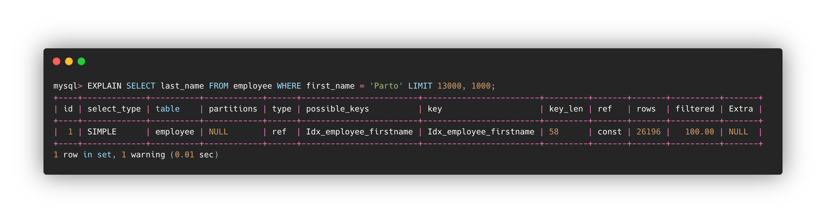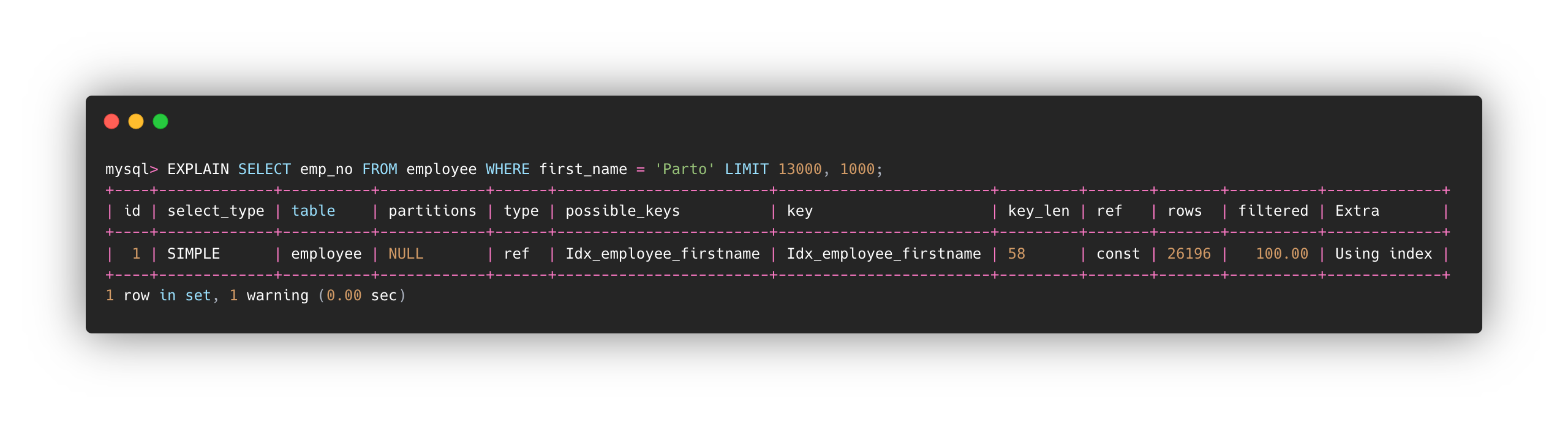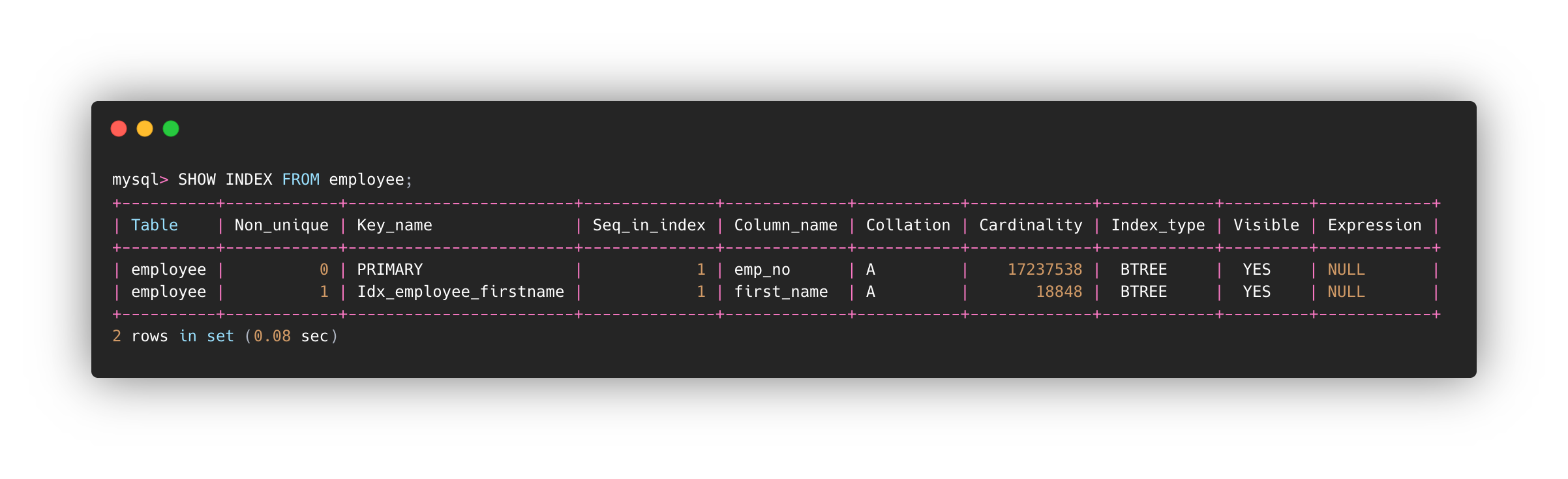 버전은 8.0.17이고, employee라는 테이블에 emp_no (PK) 와 first_name (IDX_employee_firstName)을 인덱스로 잡았습니다.