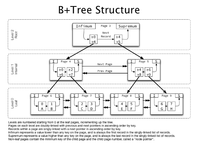 Level 2의 Internal Node에서는 >=0에 부합하지 않고 >=2 → 7에 부합하기 때문에 Page 7을 조회하고, Page 7에서 3을 찾으면 되는 것이죠.