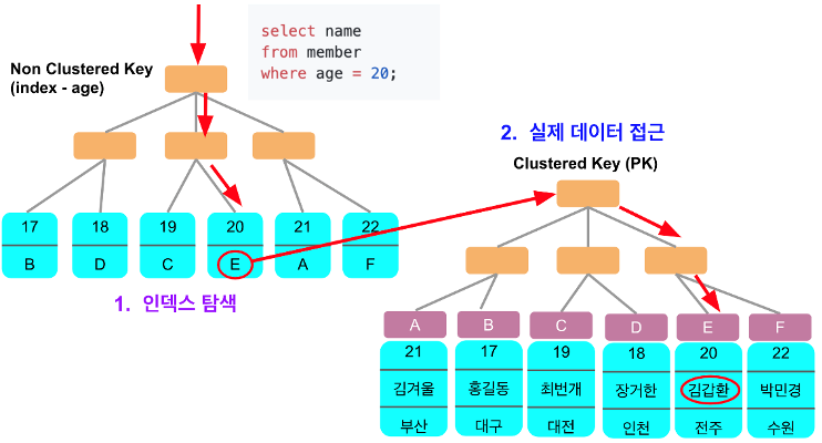 즉, 인덱스 조건에 부합한 WHERE 조건 절이 있더라도 SELECT 중 인덱스에 포함된 컬럼 외 다른 컬럼 값이 필요한 경우에는 Clustered Key에 있는 Clustered Key 값으로 데이터 블록을 찾는 과정이 필요합니다.