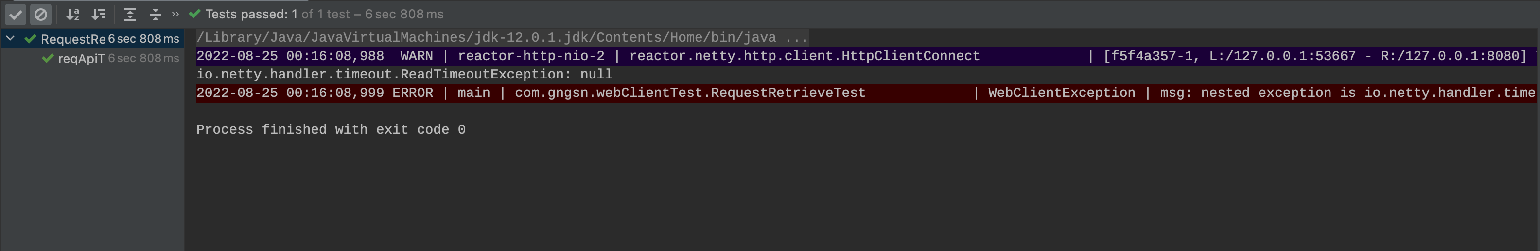 Assertions으로 "ReadTimeoutException"이 포함된 메세지인지를 검증하는 테스트를 성공적으로 마쳤습니다.