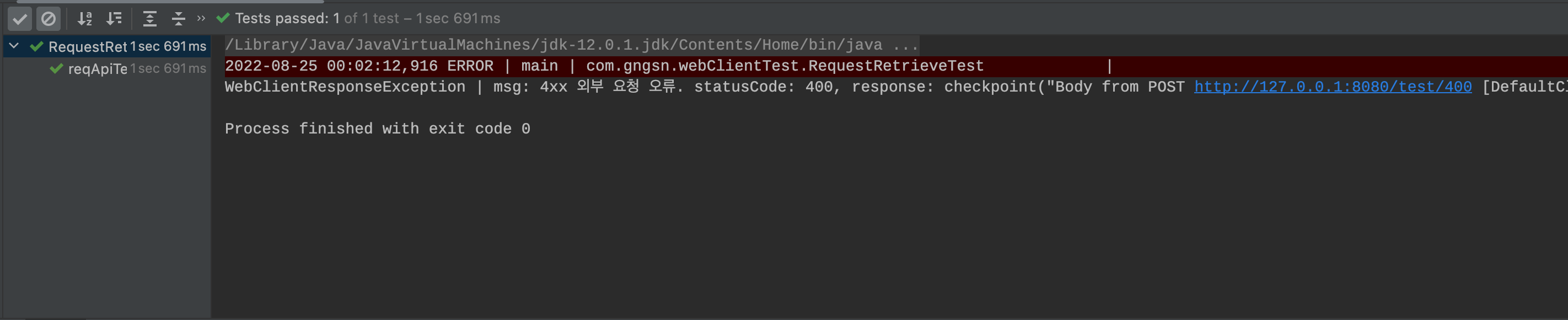 빨간 줄의 Log Level - Error가 잘출력되었고, Assertions으로 테스트 검증을 성공적으로 마쳤습니다.