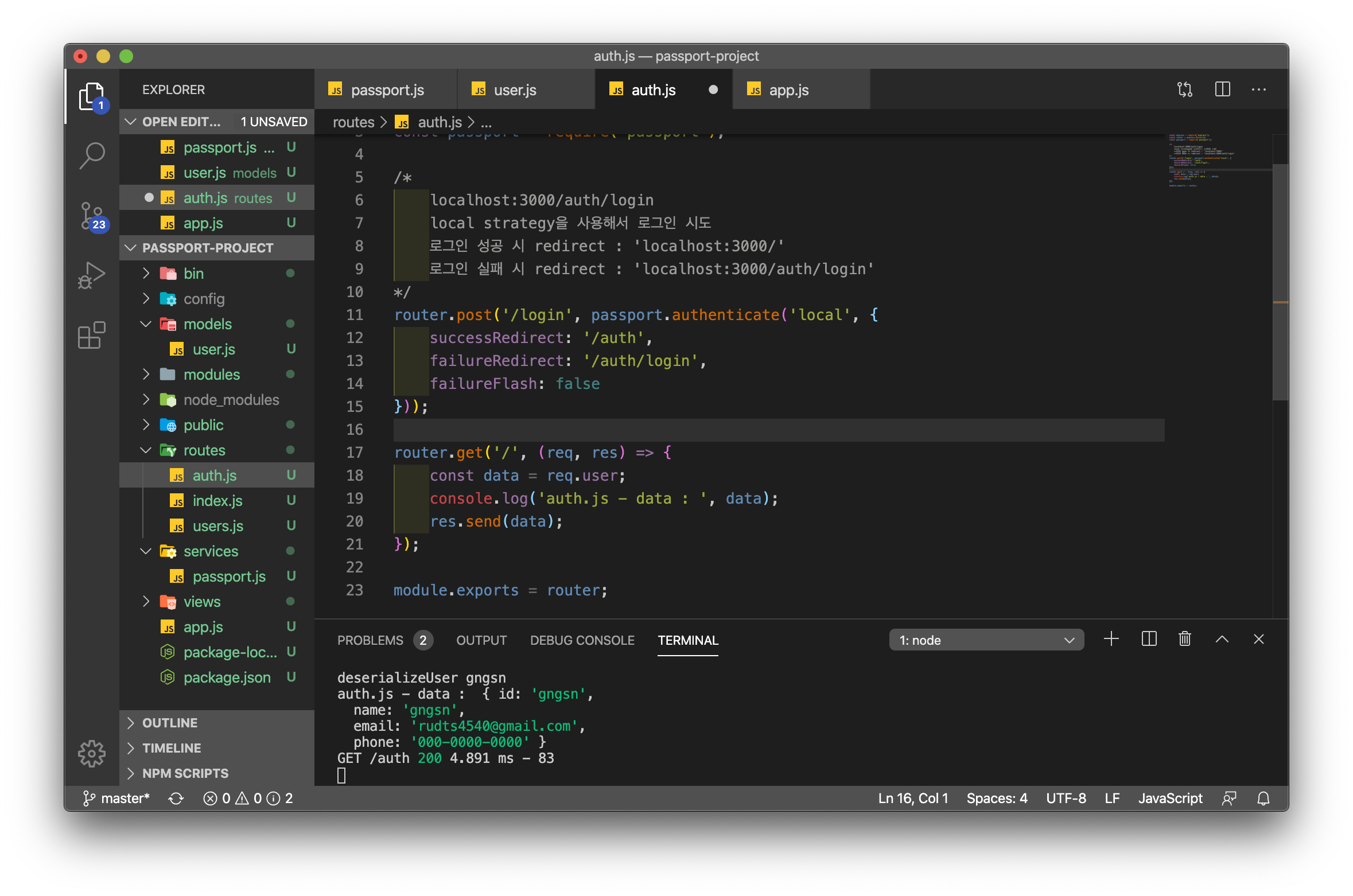 하지만, 반대로 서버와 express 이 조금 어려운 분들은 passport는 아마 도전이지 않을까 싶네요.
