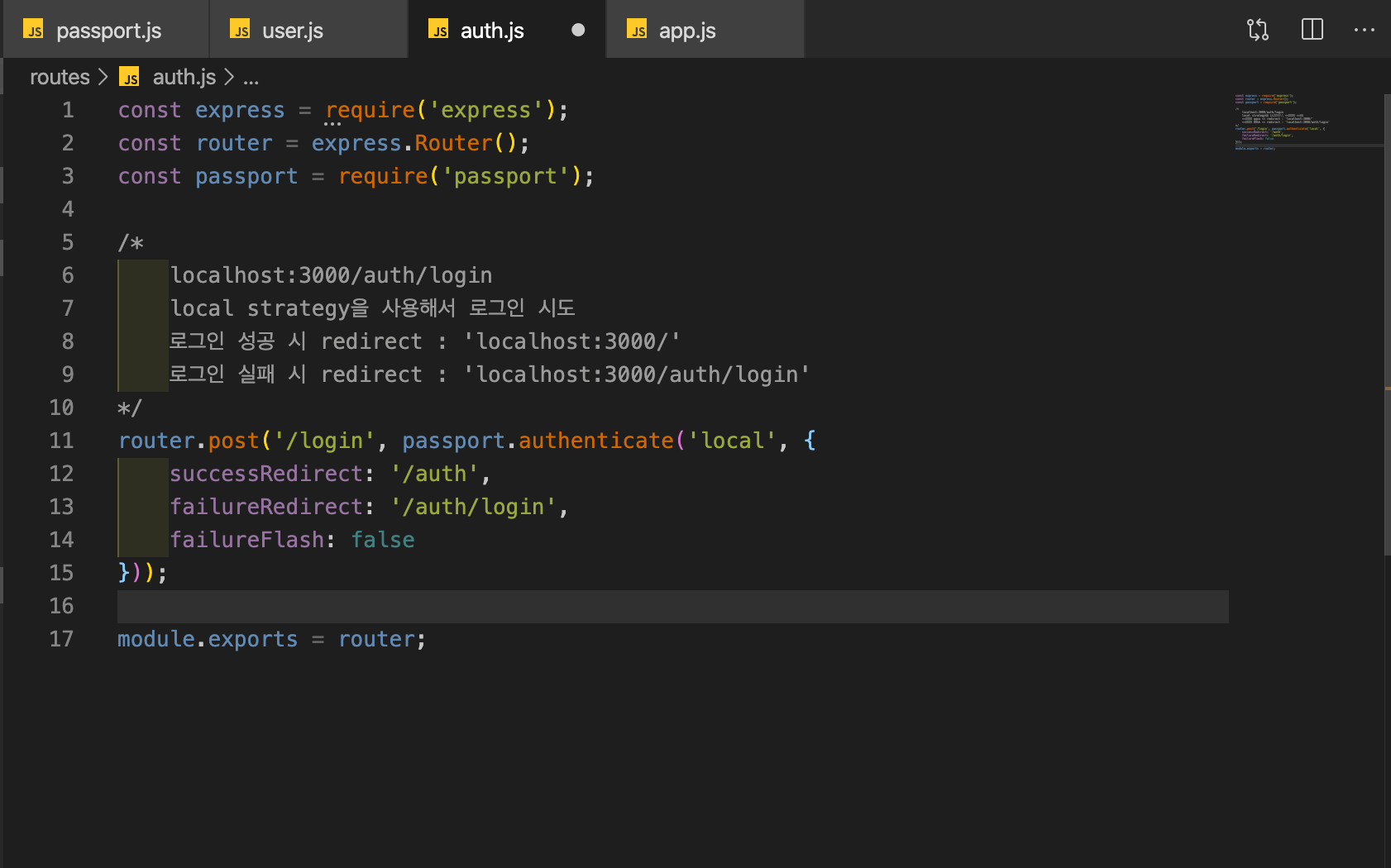 테스트를 해보기 전에 routes/auth.js를 다시 한 번 살펴볼게요.