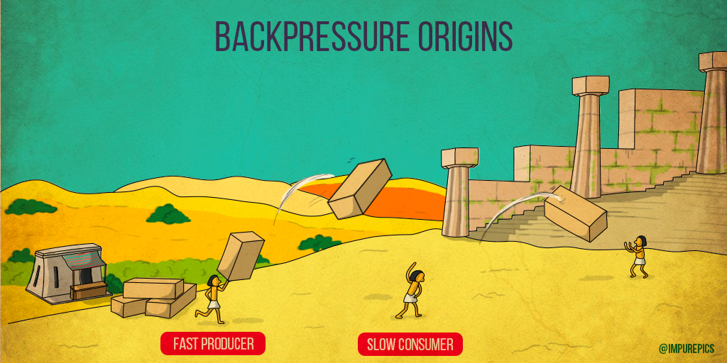 Backpressure는 '배압'이라는 의미를 가집니다. 흔히 배압이라고 하면 유체 흐름의 저항력을 의미합니다. 물이 흐르는 배수관의 통로 크기가 갑자기 작아지는 구간을 생각해보세요. 가령, 10m 였던 배수관의 너비가 1m로 갑자기 작아지는 구간이 있을 때, 오른쪽으로 흐르던 물의 흐름은 해당 구간에서 왼쪽 방향으로 힘을 받게 될 것입니다. 이 힘을 받아 10m만큼의 물이 전부 흐르지 않고 1m만큼의 물이 흐를 수 있게 되죠. 일상 생활에서 세면대 아래의 구부러진 배수관도 이 원리를 이용합니다. 구부러지지 않고 직선으로 흐른다면 물은 굉장히 빠르게 지나갈테지만, 구부러진 구간에서 아래로 흐르던 물은 반대 방향의 힘을 받아 한 번에 너무 많은 물들이 내려가지 않도록 조절합니다.