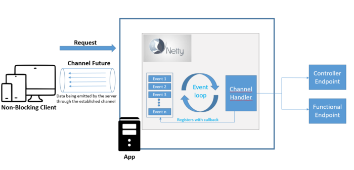 클라이언트와 서버 사이의 Connection은 channel을 통해 생성됩니다. Netty의 이벤트 루프는 이벤트를 찾는데, 모든 이벤트를 처리할 때까지 FIFO 형식의 이벤트 루프와 이벤트를 저장하는 내부 이벤트 큐를 가집니다. ChannelHandler는 호출을 위한 정확한 endpoint를 찾는데 @RestController나 함수형 웹 endpoint의 어노테이션이 붙여진 클래스를 찾습니다. Netty 이벤트 루프는 각 요청을 Channel과 연결하는데, 이를 통해 응답을 전송해야 하는 채널을 알 수 있습니다.