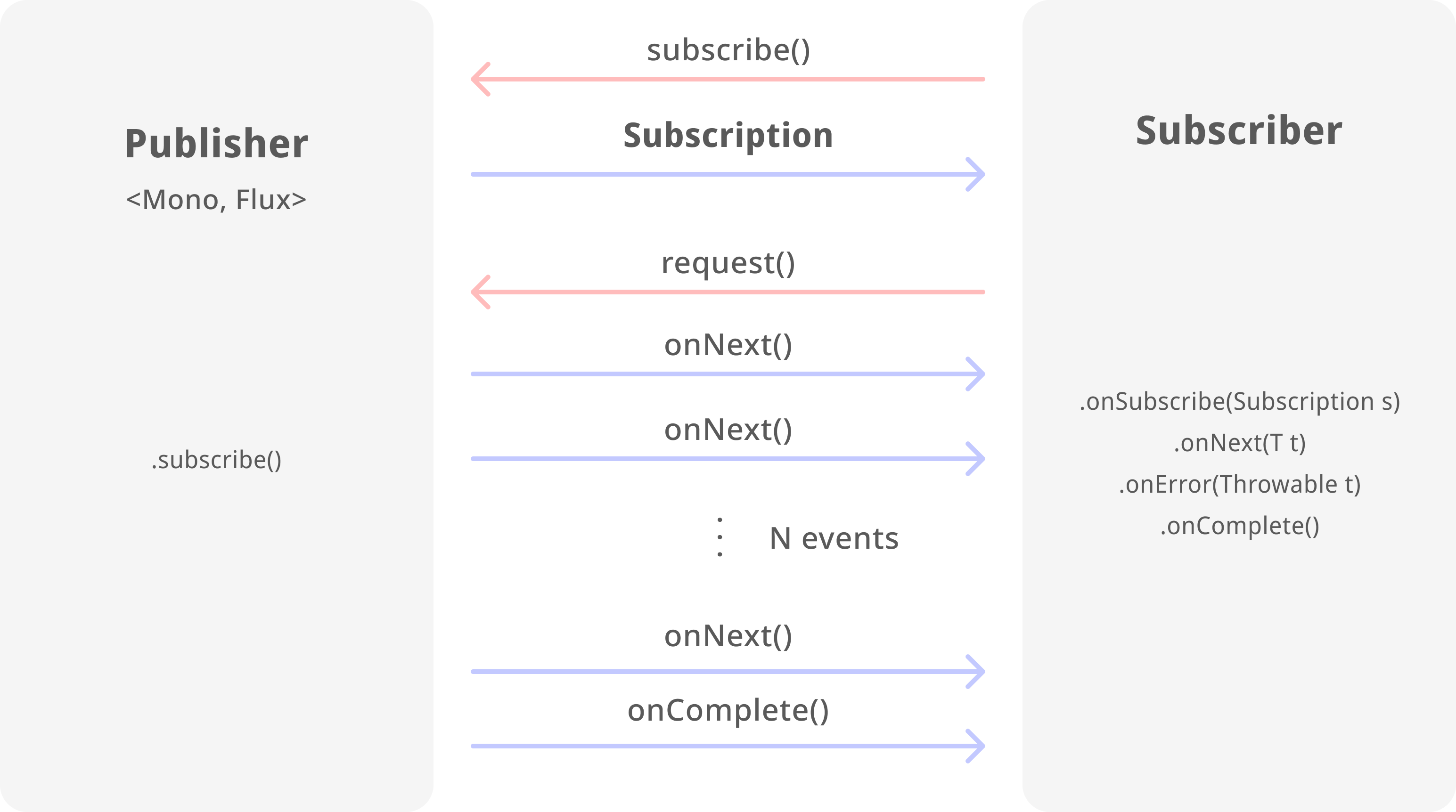 Reactive programming은 새로운 프로그래밍의 패러다임이며, 비동기 방식에 논블럭킹으로 처리합니다. 데이터는 이벤트/메세지로 발동되는driven 스트림으로 흐릅니다. 스레드는 Blocking 되지 않고 데이터가 사용될 수 있게되면 바로 스트림을 통하여 사용자에게 보내집니다. 한 번 모든 데이터가 반환될 때 성공적이라면 onComplete() 이벤트를 통해 얻을 수 있고, 만약 프로세스 중 예외가 발생한다면 onError() 이벤트로 받습니다. 또한 onNext() 이벤트를 통해 observer가 시퀀스 내 새로운 요소 발견하는 것을 알려notification줄 수 있습니다.
