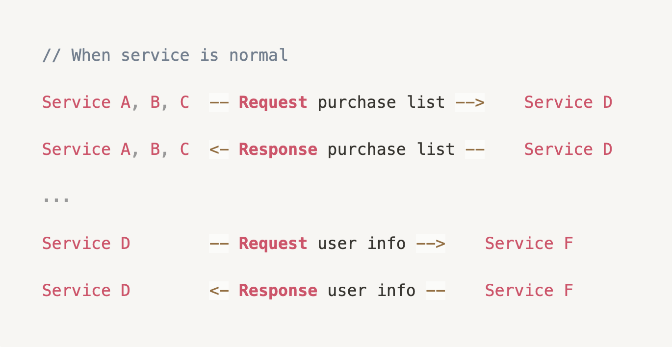 Service D가 Service F에게 요청을 보냈을 때 Service F의 오류로 Service D에게 정상적인 응답을 주지 못했습니다. Service D는 그에 상응하는 로직이 정상 처리되지 못하고 오류가 발생할 수 있습니다. 이 때, Service A, B, C가 Service D로 요청을 보내고, Service D의 오류로 제대로된 응답을 주지 못합니다. 이에 따라 Service A, B, C는 오류가 전파됩니다.