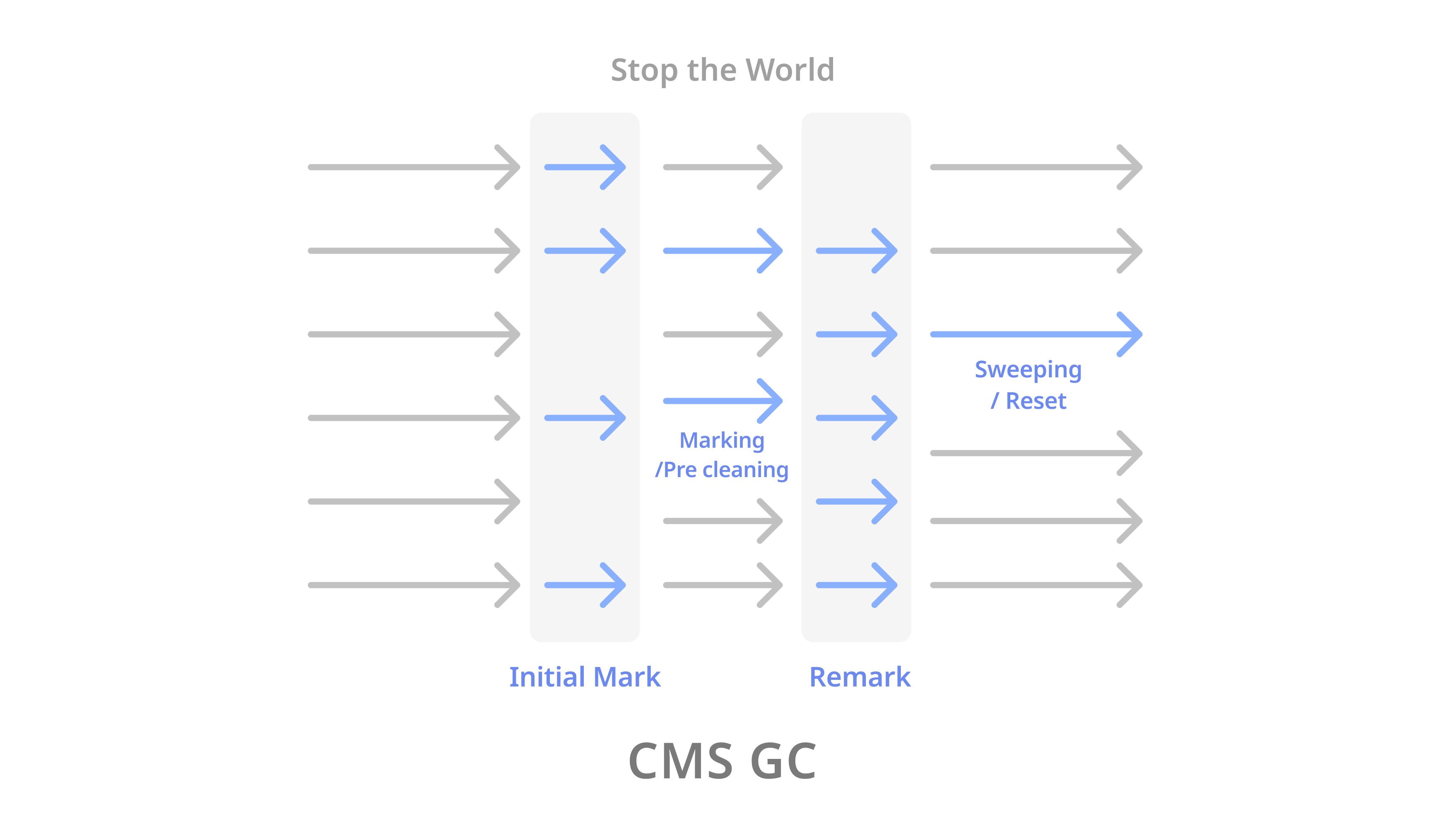 멀티 스레드를 통해서 Stop The World 대기 시간이 짧아졌지만, 조금 더 개선할 여지가 있었고 계속해서 이 대기 시간을 줄이려 노력했습니다. 그래서 다음 세대인 CMS GC가 등장하게 됩니다.