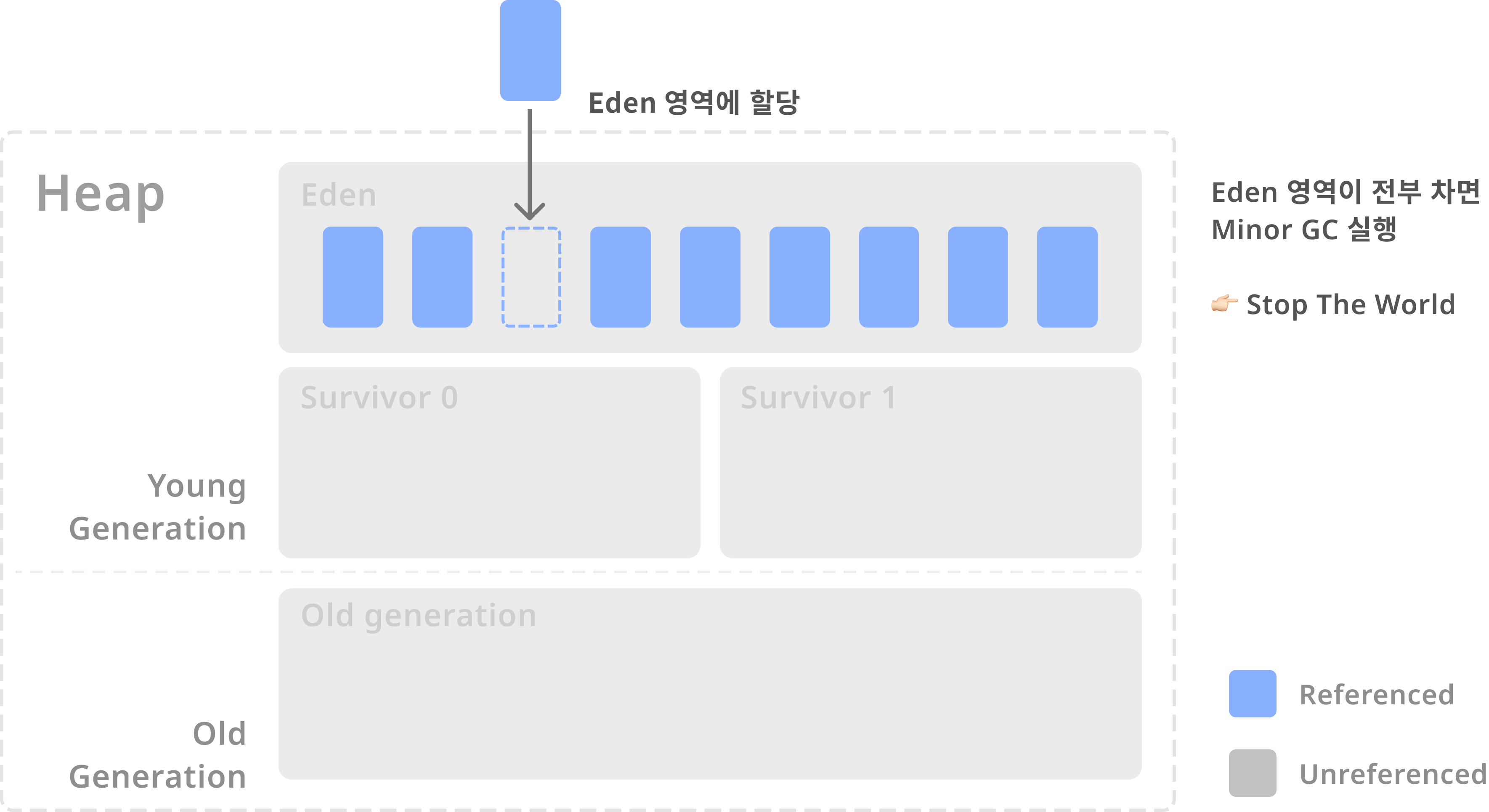 Eden 영역이 가득차면, minor GC가 실행됩니다.