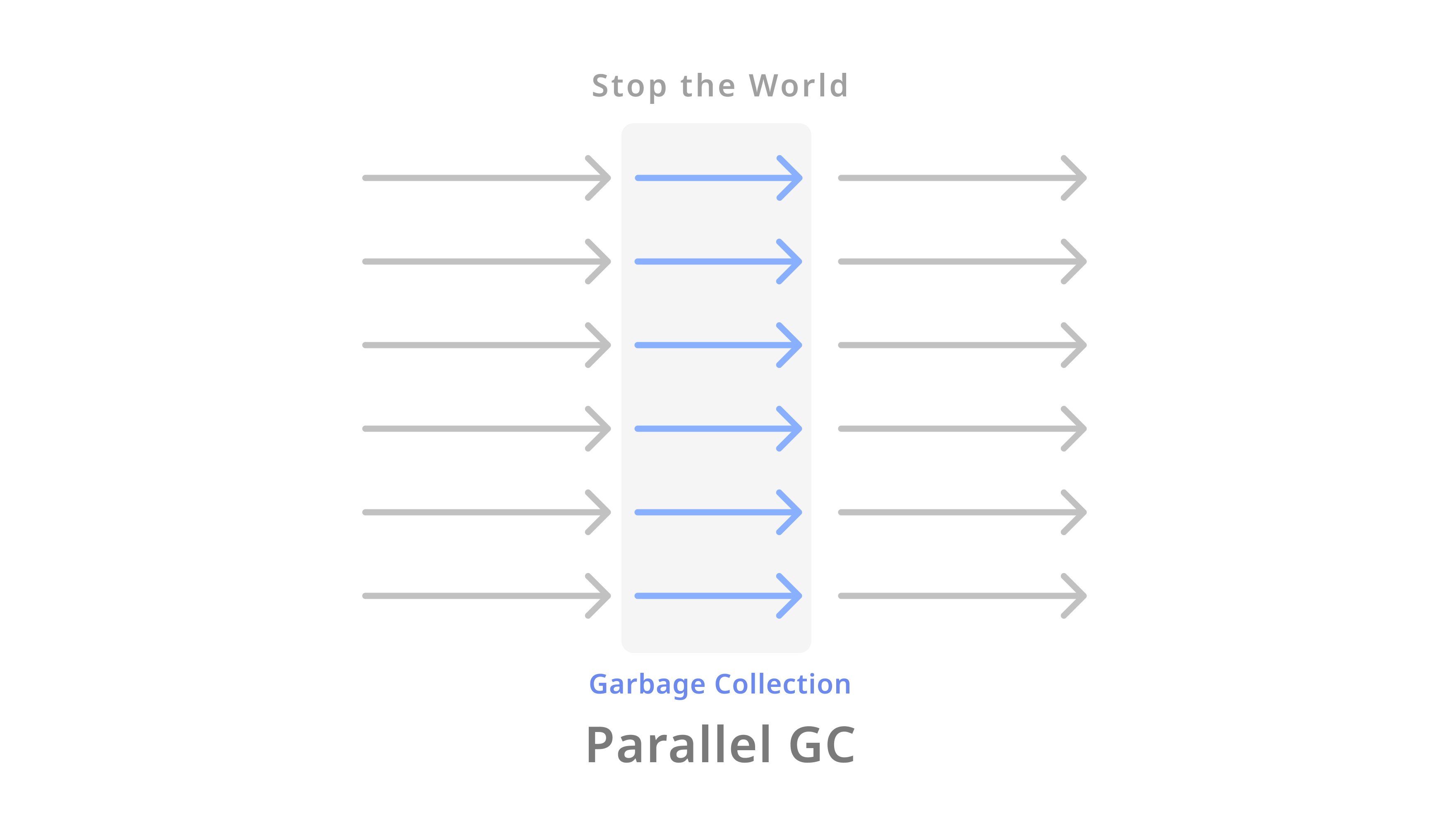 Parallel GC는 여러 스레드를 사용하여 Garbage Collection을 진행합니다. 멀티 스레드를 사용하기 때문에, Java 8에서 Default로 사용되었습니다. 이전 세대의 GC인 Serial GC 보다 Stop The World 대기 시간이 더욱 짧아졌습니다. Parallel CG는 멀티 코어 환경에서 사용될 수 있습니다.