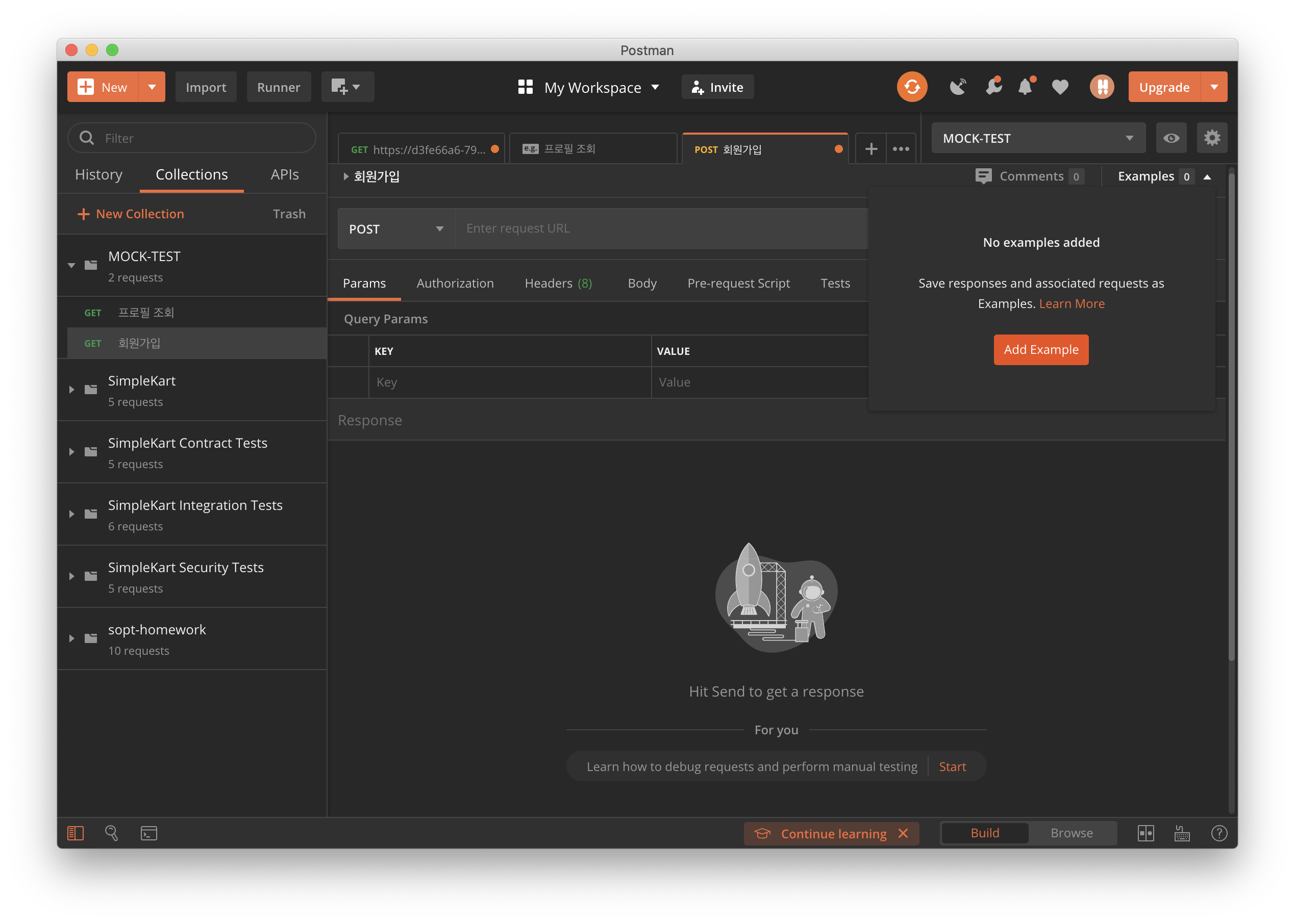 요청 윈도우 우측 상단을 보면 Comment 0 / Example 0 이라는 버튼이 있어요