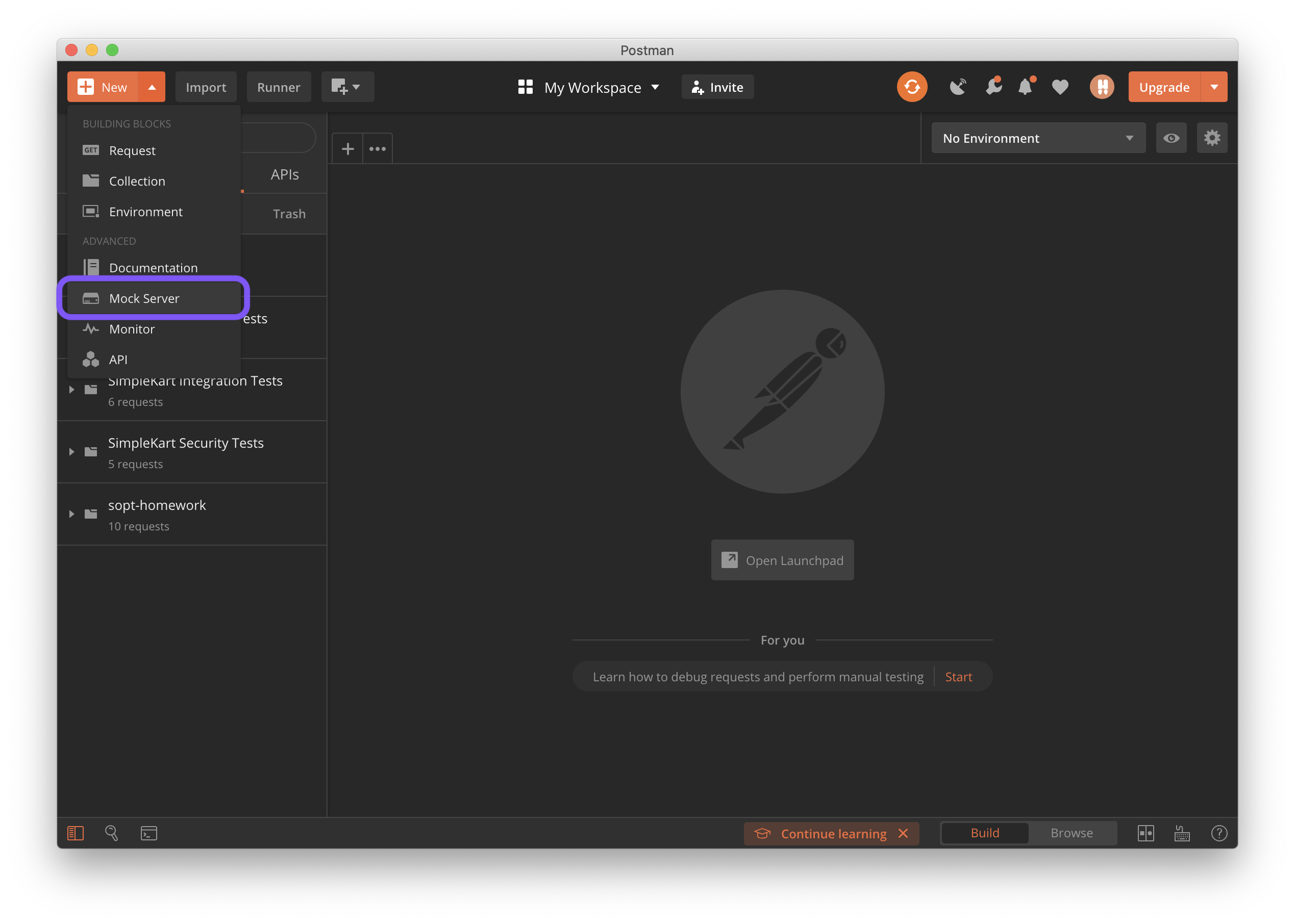 일단, dashboard로 가야하는데 MOCK-SERVER Collection을 펼치면 View in web이 있어요.