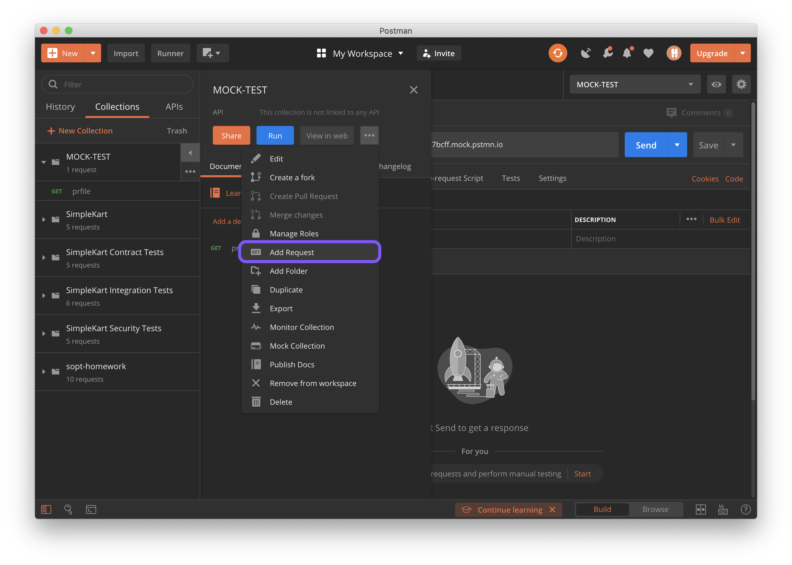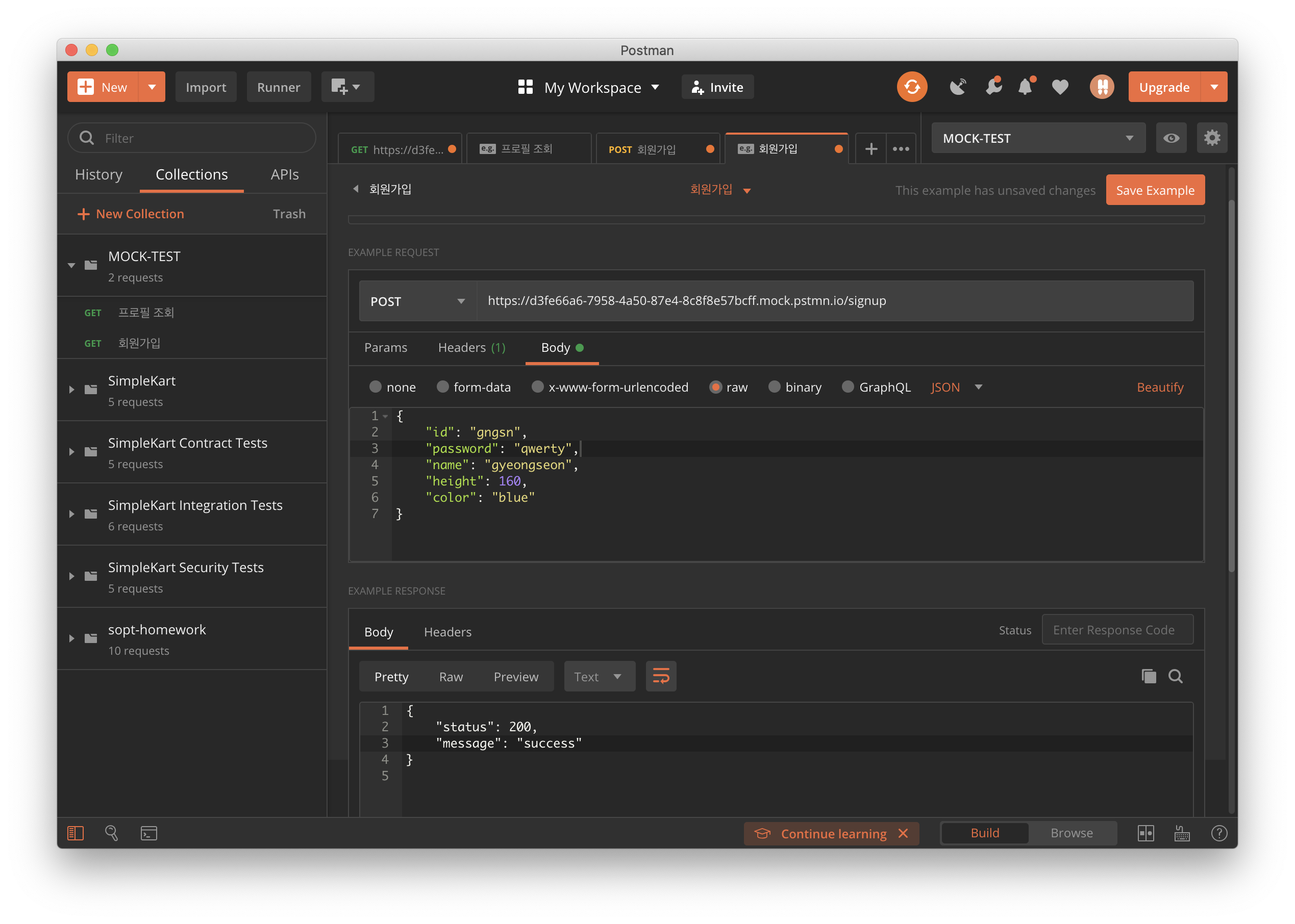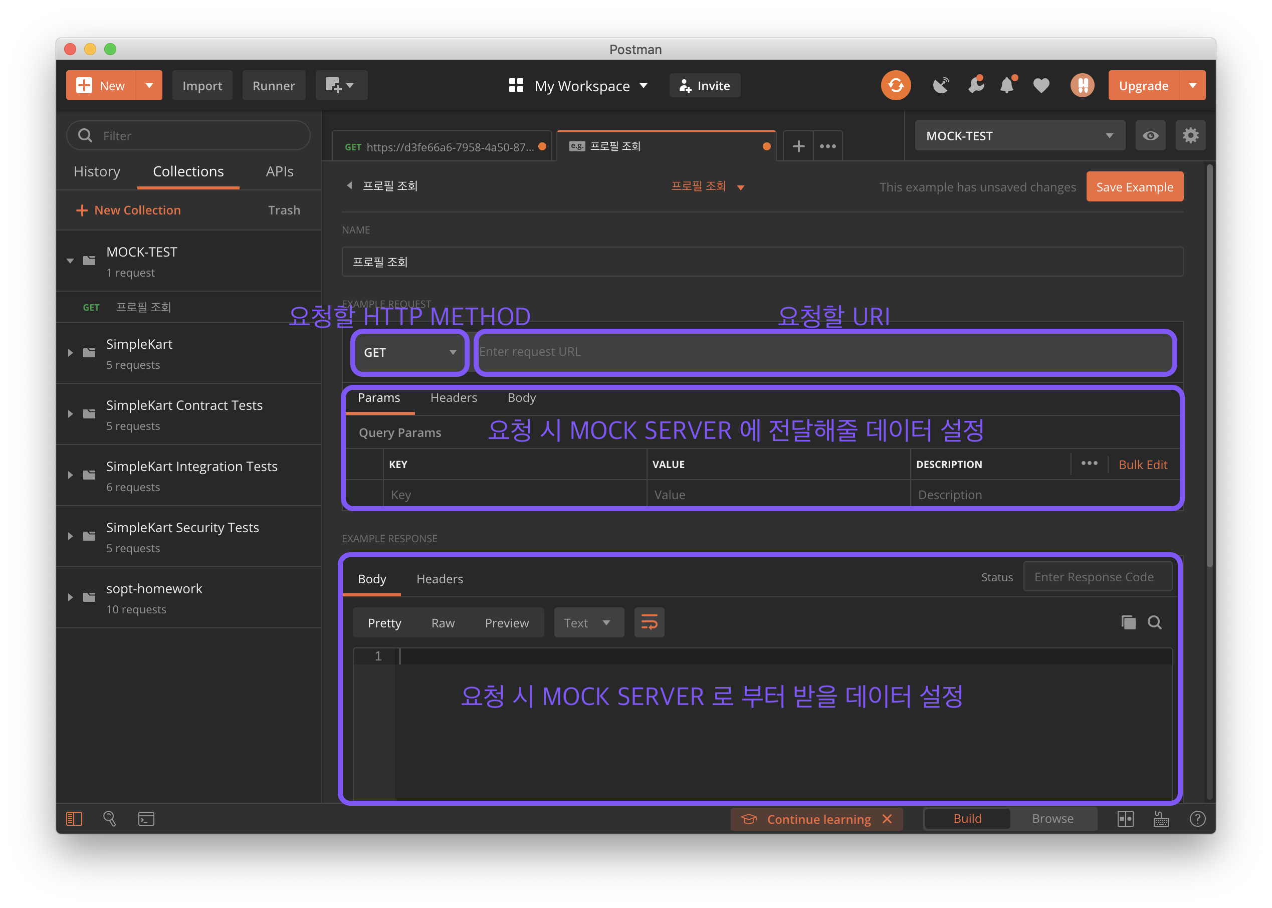 요청 식별자를 정해주시고 'save to <mock server 식별자>' 를 선택해주세요!