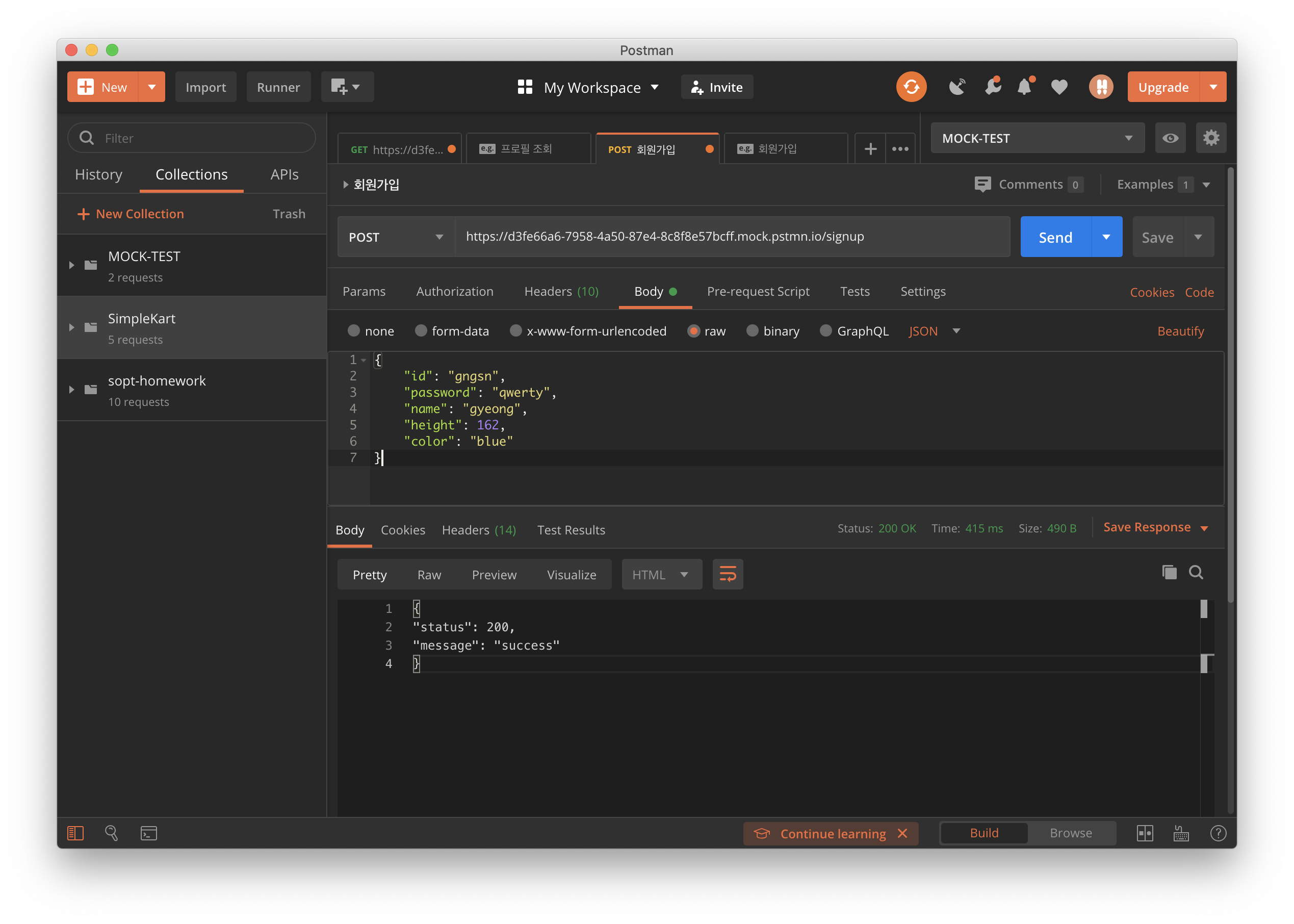 저는 위와 같이 Body > raw > JSON으로 요청을 받게끔 만들고