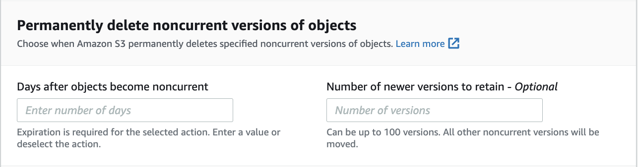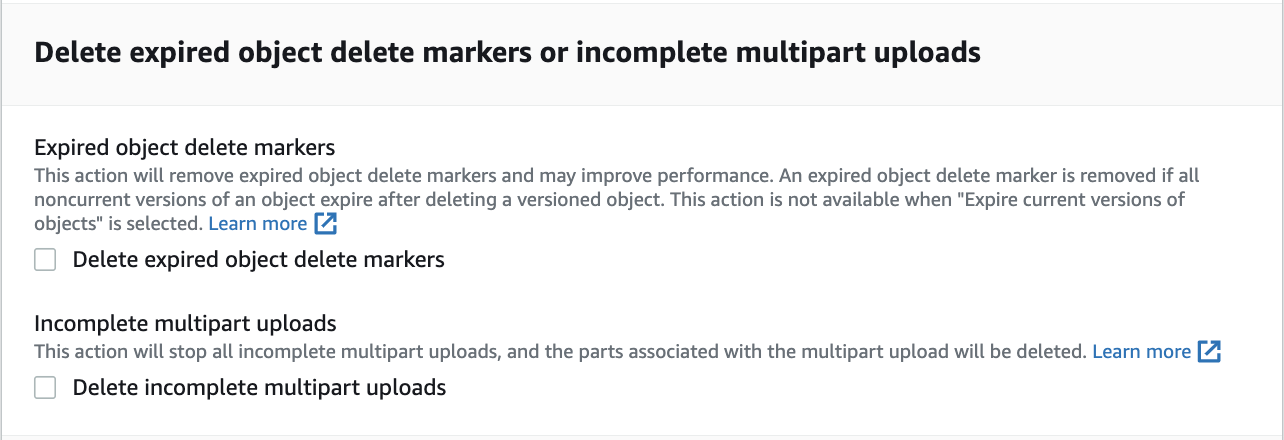 혹은 delete marker가 표시되었거나 완료되지 않은 멀티파트 업로드를 삭제하도록 구성할 수 있는데, 가령 끝났어야 할 업로드가 2주째 진행되지 않는 멀티파트 업로드를 삭제하도록 설정할 수 있습니다.