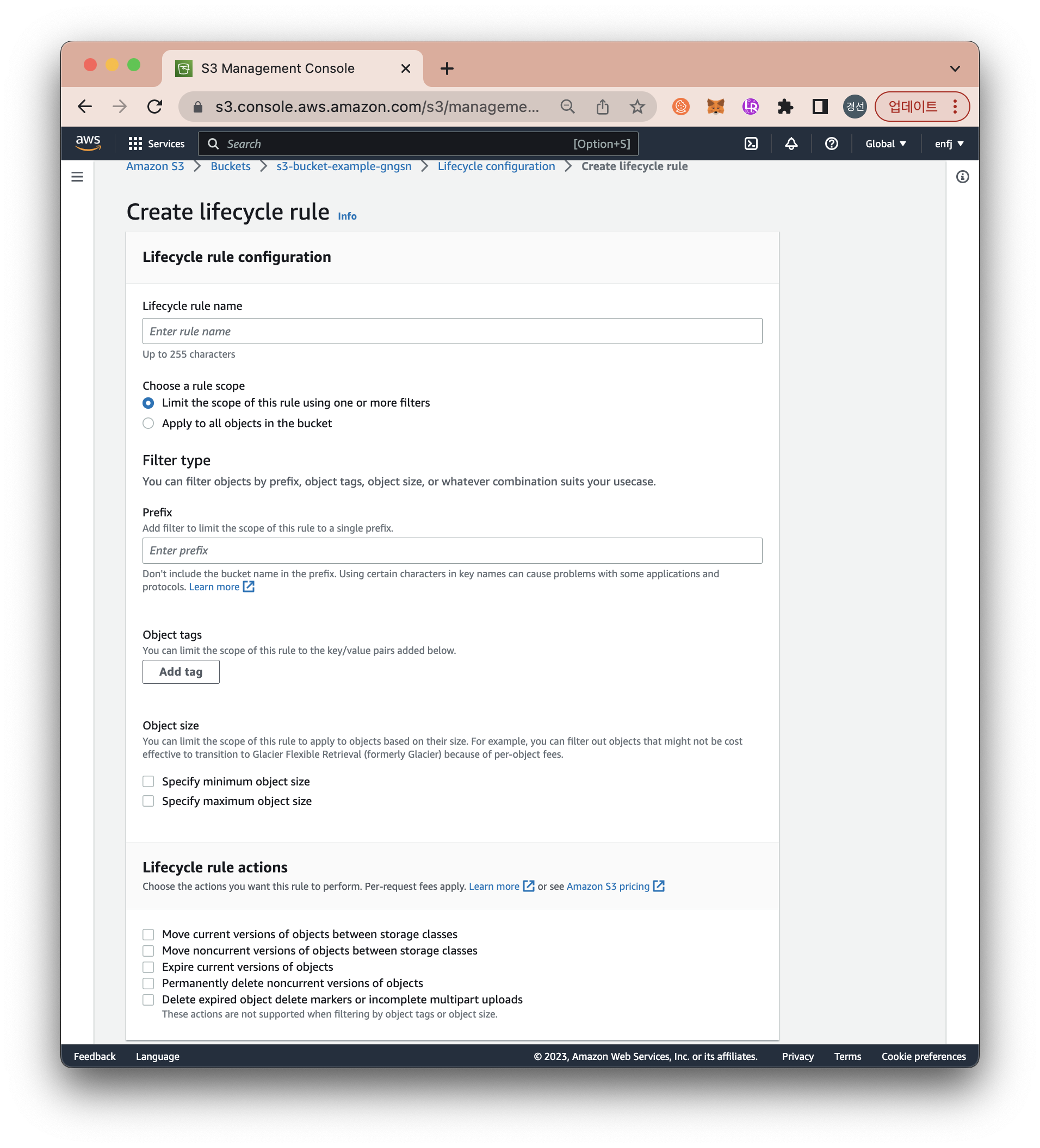 하나 이상의 필터를 사용해서 범위를 제한하거나, 버킷 내의 모든 객체에 반영할 수 있습니다. 첫 번째 옵션의 필터 지정은 Prefix(접두사), Tags(태그), Object Size(사이즈)을 선택하여 적용할 수 있습니다.