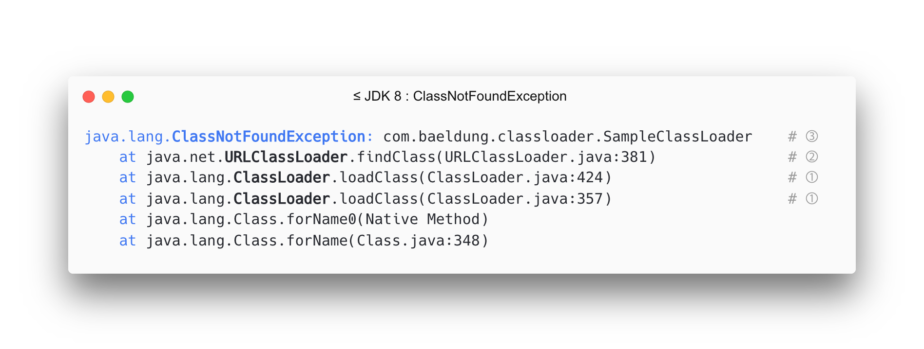 ClassNotFoundException - ClassLoader가 Class.forName() , ClassLoader.loadClass() 또는 ClassLoader.findSystemClass() 를 사용하여 클래스를 로드하려고 하지만 지정한 이름의 클래스에 대한 정의를 찾을 수 없는 경우에 발생합니다.
