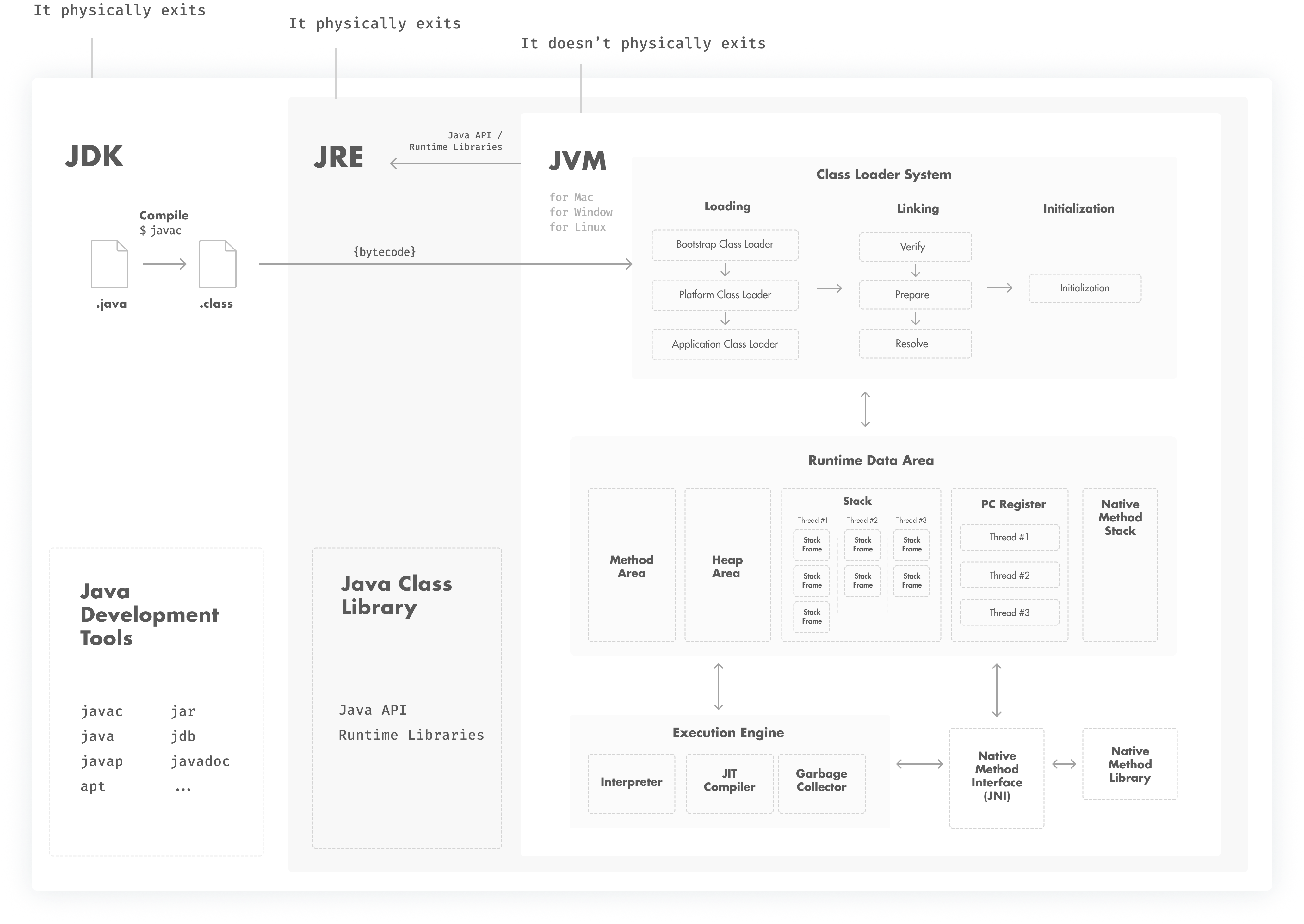 JDK으로 개발하고 난 후, JVM의 메모리에 컴파일된 바이트 코드를 올리면, JRE를 통해서 해당 로직을 실행하게 됩니다.