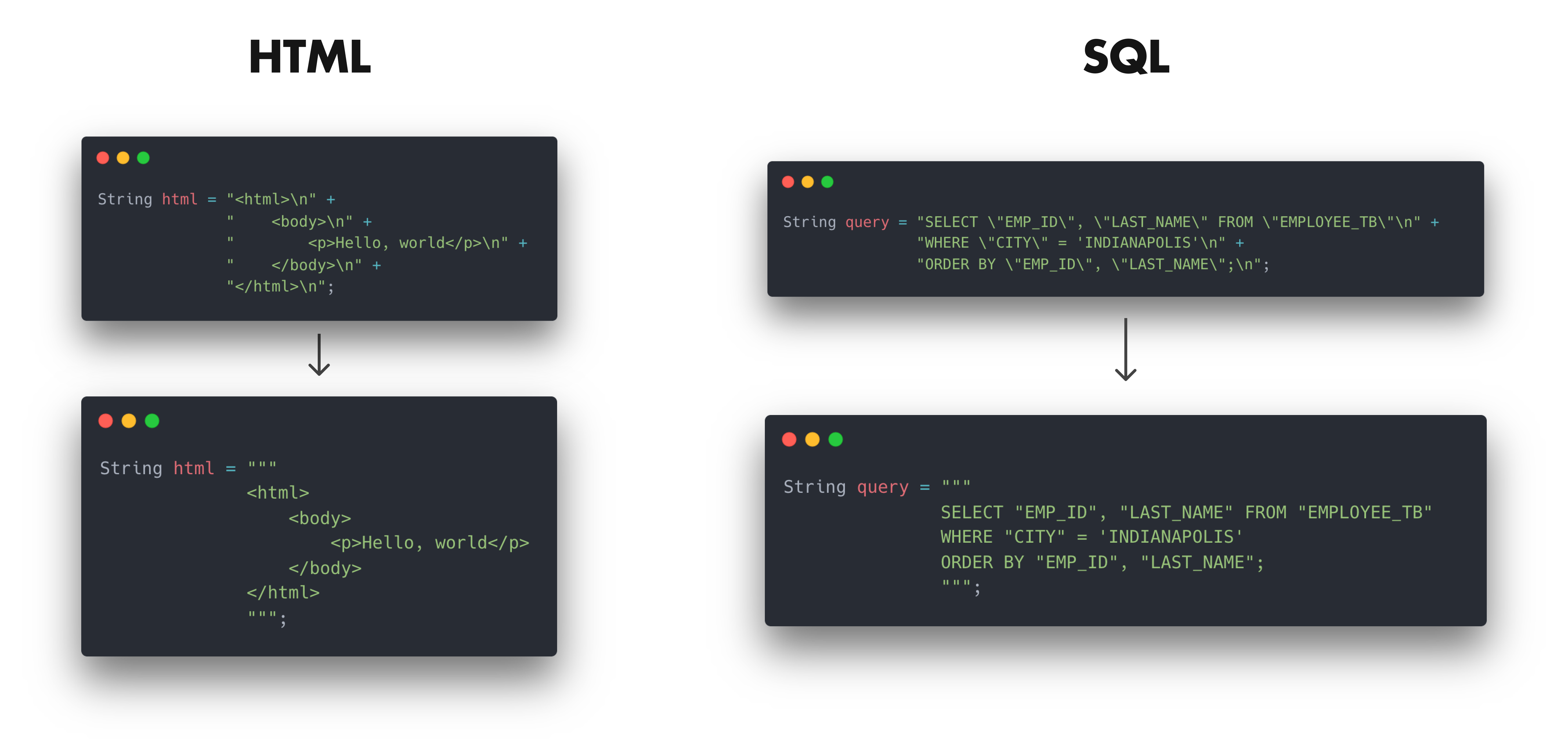 JDK 15에서 정식으로 릴리즈될 Text Block의 Preview가 소개되었습니다. 자세한 내용은 15에서 다루겠습니다.