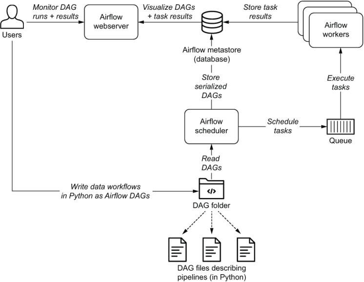 이러한 결과들은 Airflow의 metastore과 통신하여, 사용자는 Airflow가 제공하는 웹 인터페이스를 통해 Task들의 진행을 추적하고 그들의 로그를 볼 수 있습니다.