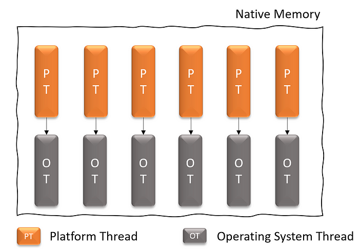 JDK는 기본적으로 Plarform Thread 라고도 불리는 Java Thread 와 OS Thread 가 일대일 관계로 동작합니다.