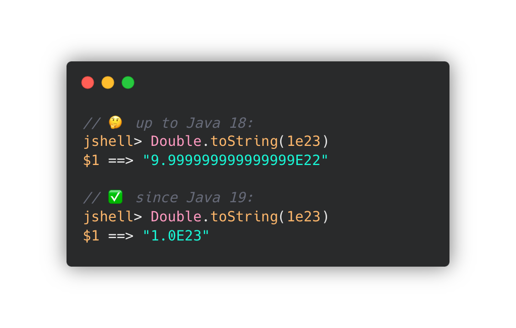 가령, 이전 JDK 릴리즈에서 "9.99999999999999E22" 를 반환했다면, JDK 19부터는 "1.0E23"이 반환합니다.