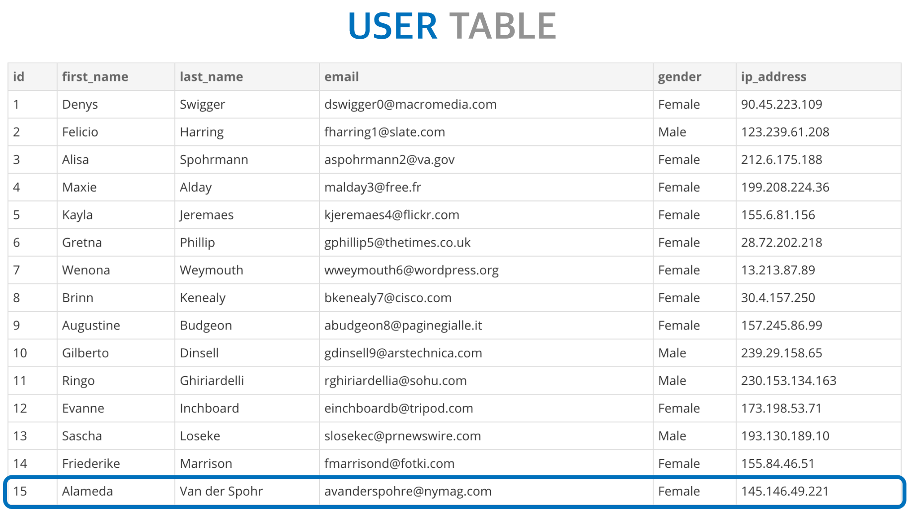 VALUES ("15", "Alameda", "Van der Spohr", "avanderspohre@nymag.com", "Female", 145.146.49.221);