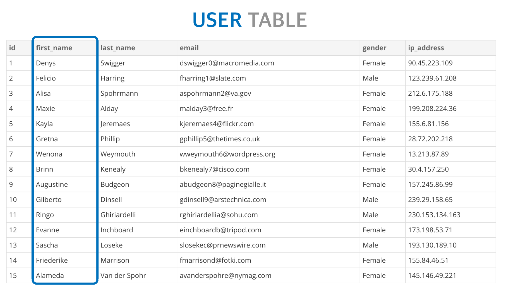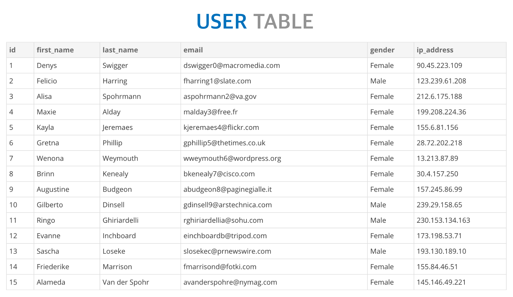 INSERT INTO user (id, first_name, last_name, email, gender, ip_address)