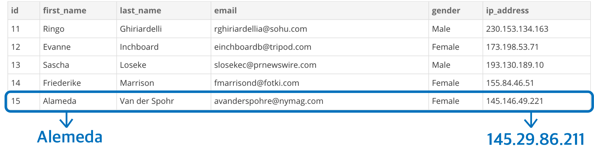 일단, first_name은 Alemeda로, ip_address를 145.29.86.211로 설정해야겠다는 생각이 드시나요?