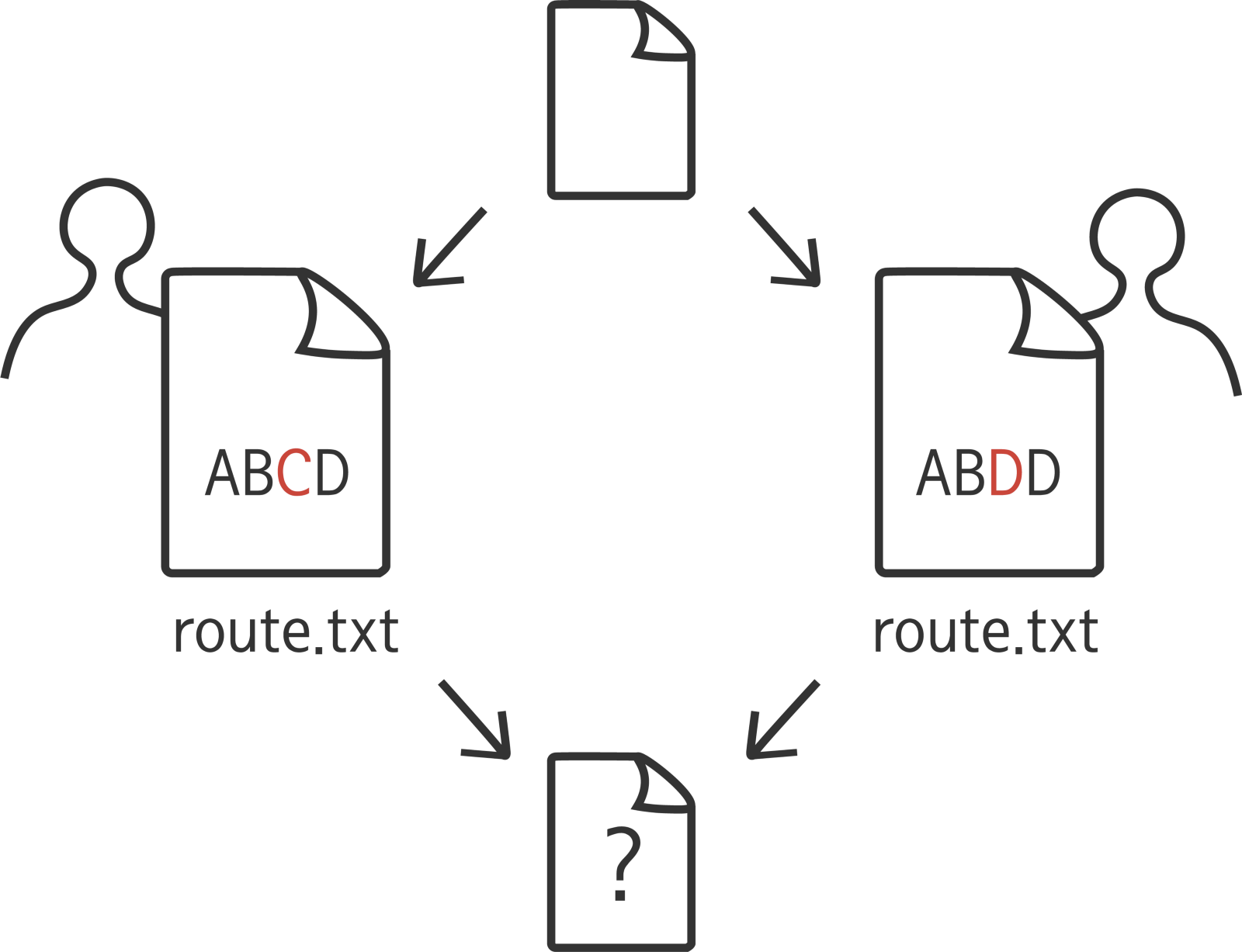 예를 들어 route.txt라는 파일을 두 사람이 각자 편집한 후 합치는 경우에 누군가가 편집한 내용이 누락되는 경우도 생기게 되죠.