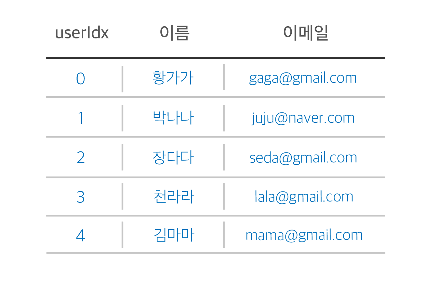 예를 들어 위의 표를 보게되면, userIdx 라는 키 값(X)을 참조하면 이름과 이메일을 확인할 수 있죠?