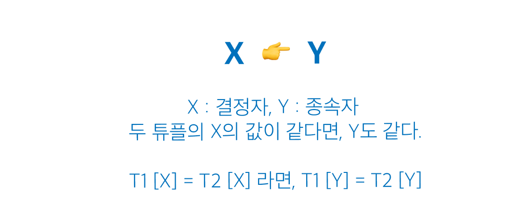 X의 값을 통해 Y의 값을 바로 식별할 수 있을 때, 혹은 X값에 따라 Y값이 달라질 때 함수적 종속이라고 합니다.