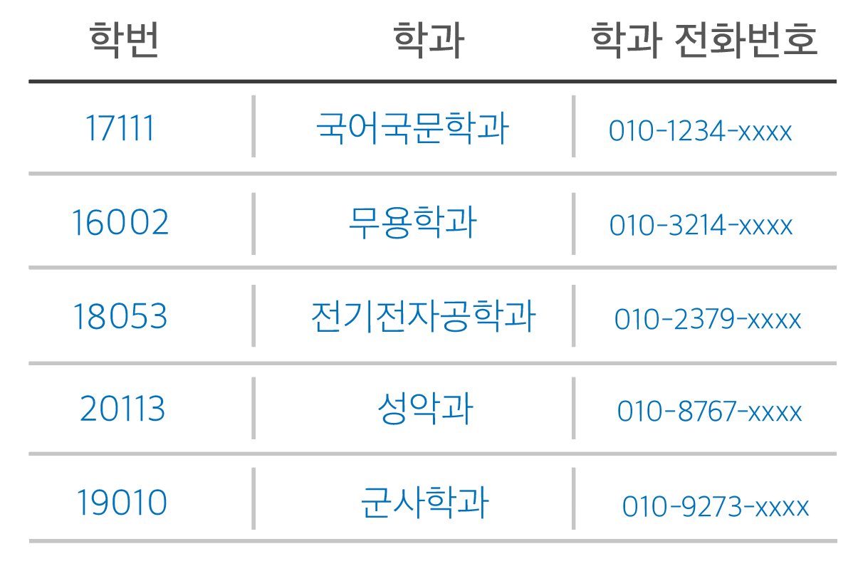 '학과'를 통해 '학과 전화번호'를 확인할 수 있습니다.