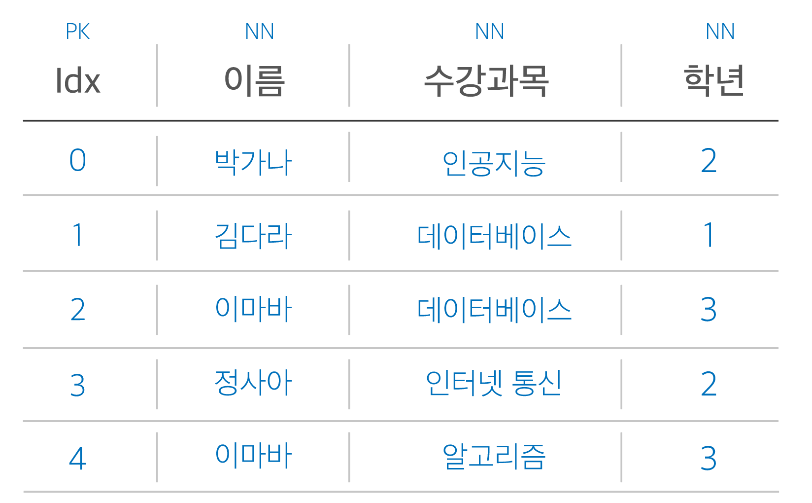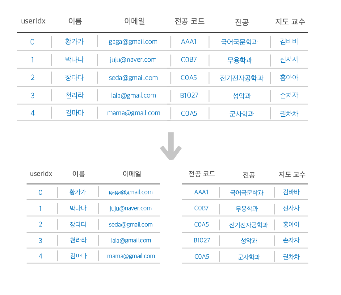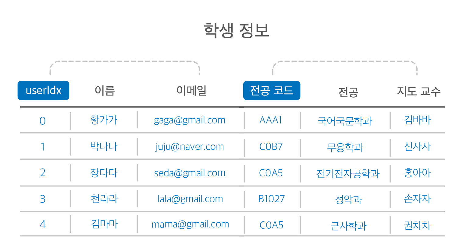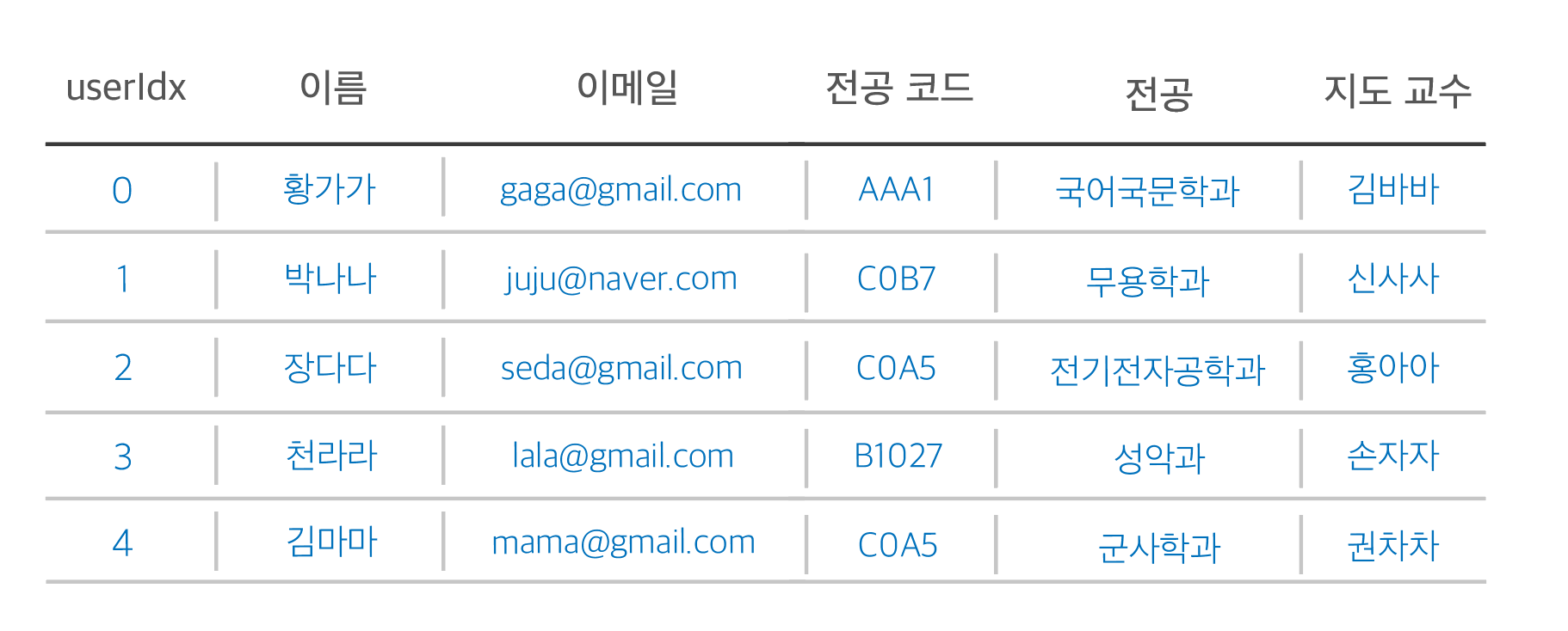 위의 데이터를 보면, '전공'이라는 데이터들은 'userIdx'로 참조할 수 있도 있겠지만 '전공코드'로 참조할 수도 있습니다.