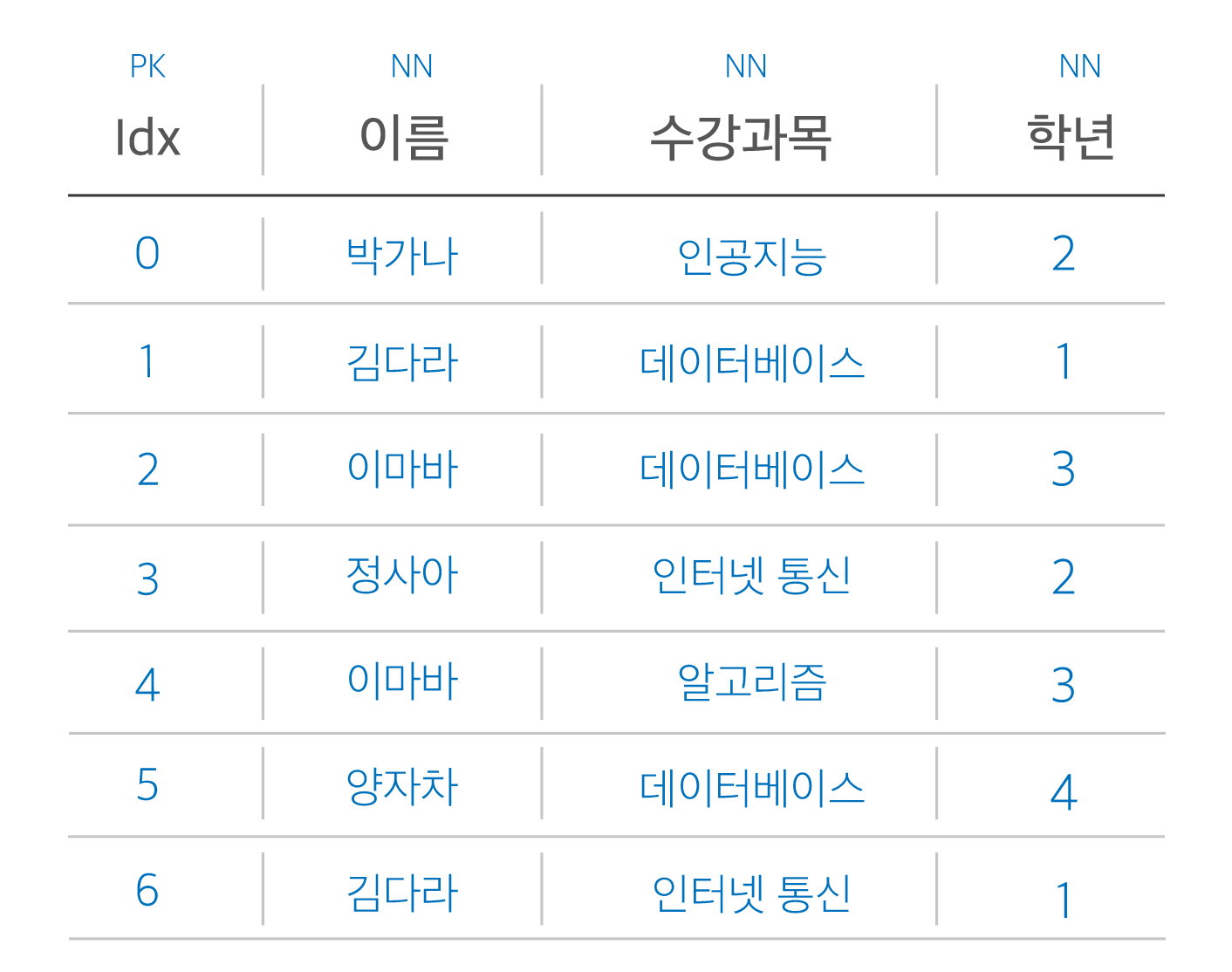 만약, 김다라가 데이터베이스 과목을 드랍하고 싶다면, 김다라에 대한 정보가 아예 사라지겠죠.