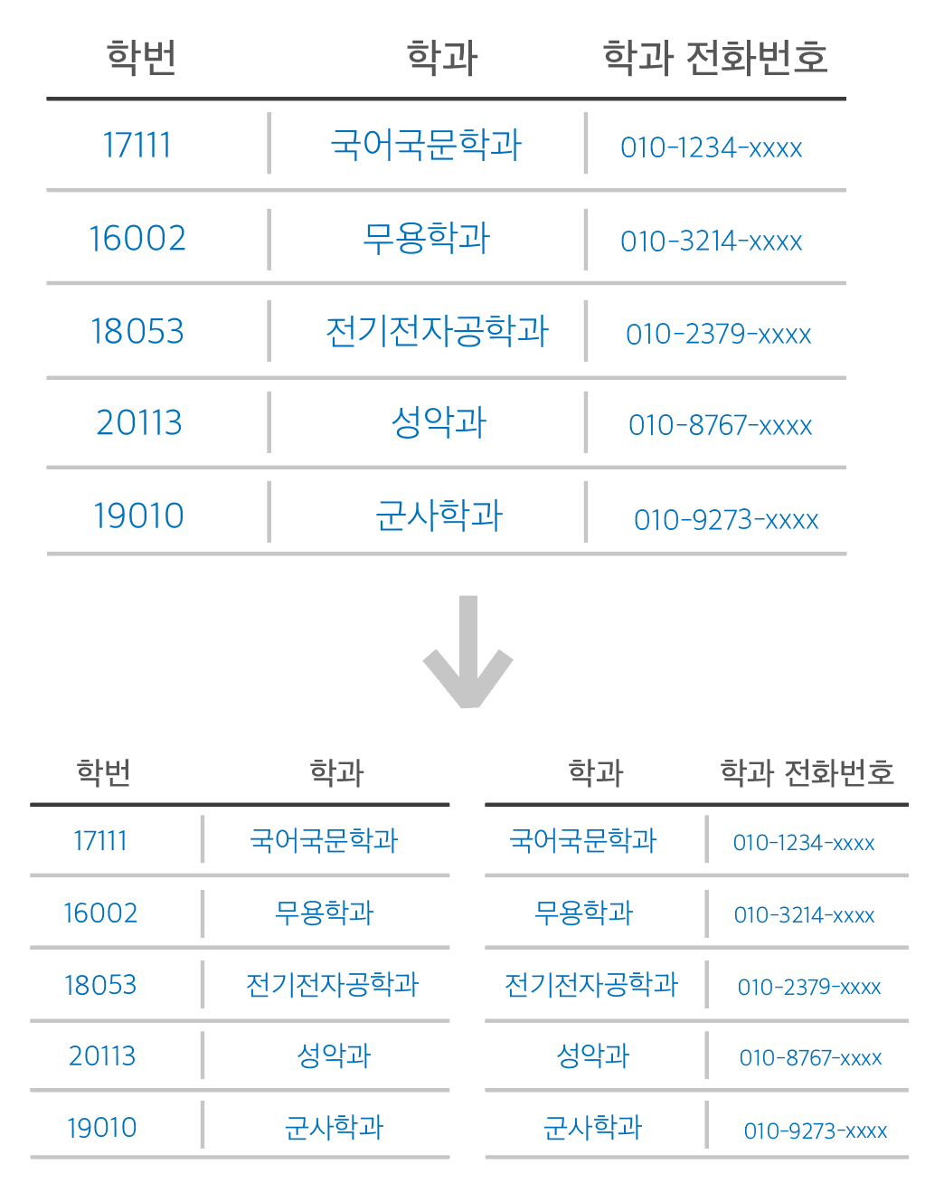 위의 표를 보면 '학번'을 함조하면 '학과'를 확인할 수 있고,