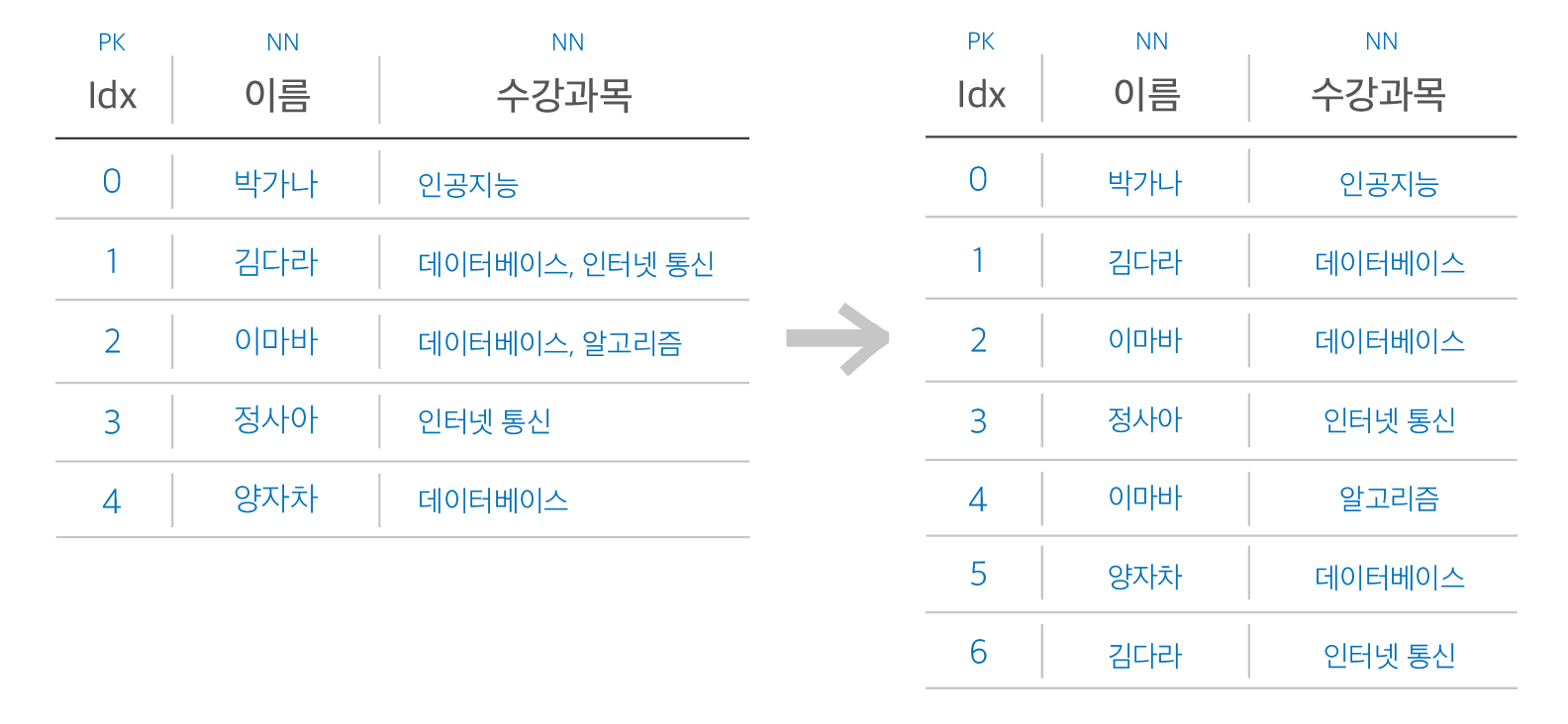 데이터는 항상 원자값(분해될 수 없는 값)을 갖음 로우마다 컬럼의 값이 1개씩만 있어야 함