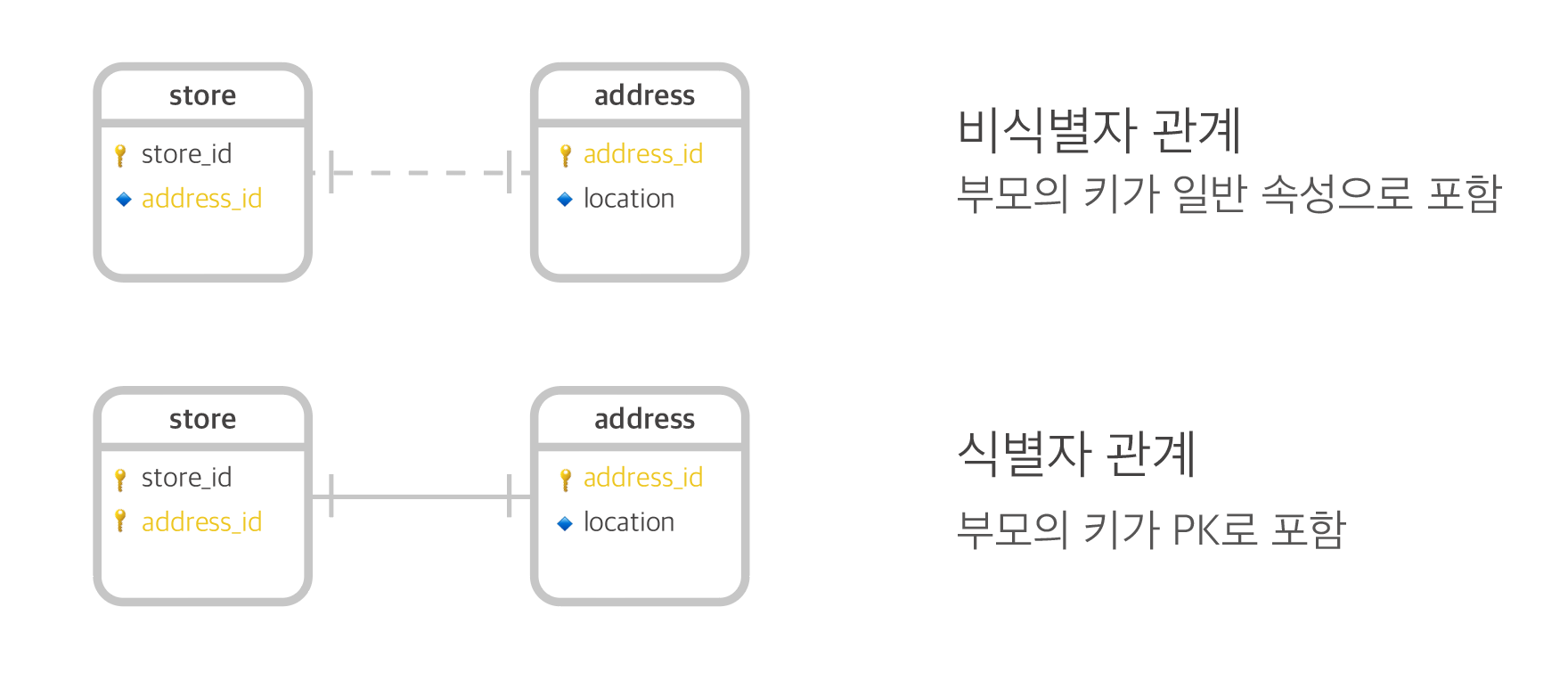 먼저, 두 관계중 부모의 키를 PK로 받는지 안받는지에 따라서 선의 종류 (점 or 실) 가 다릅니다.