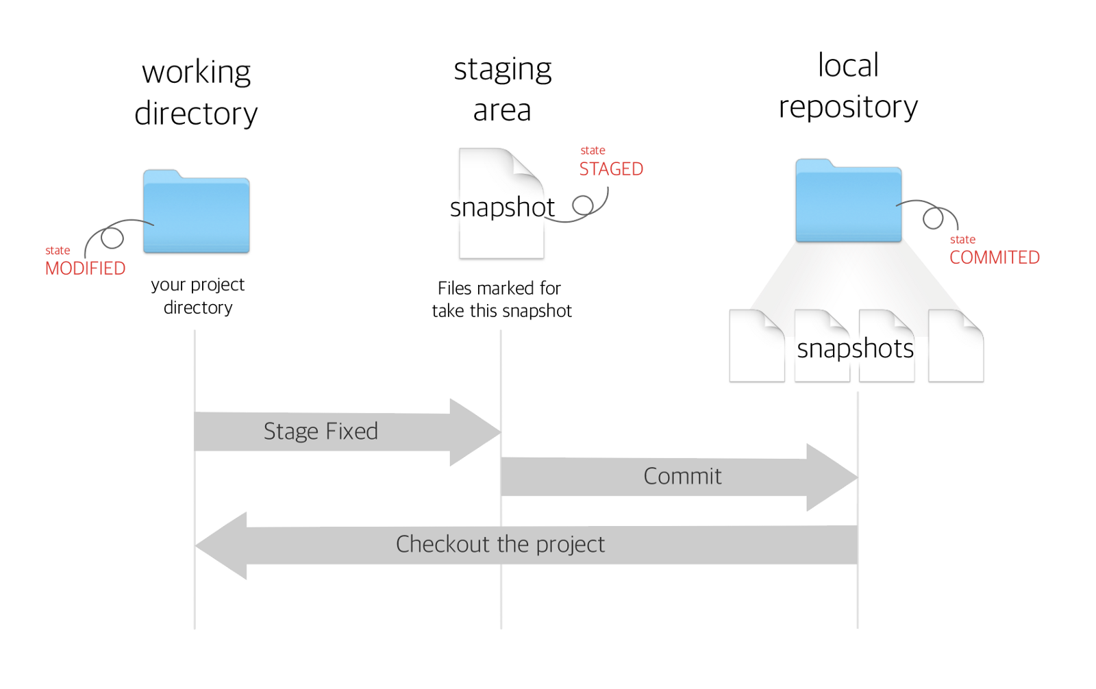 이 번 포스팅에서는 Git 활용하기에 대해서 알아보는 시간을 가져보도록 하겠습니다. 지난 포스팅에서는 Git프로젝트를 시작하는 방법에 대해서 알아보았습니다. 다시 한 번 기억을 되살려보면 아래와 같이 있었습니다.