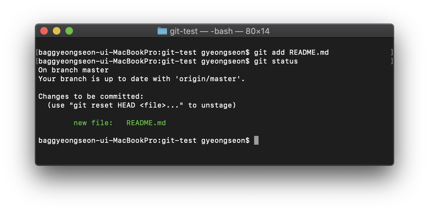 “Changes to be committed : ” 라는 의미는 staged 상태라는 의미입니다.