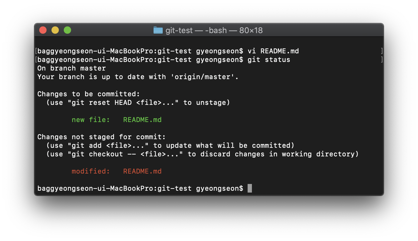 Tracked file로 바뀌어 modified라는 상태로 바뀐 것을 확인할 수 있습니다.