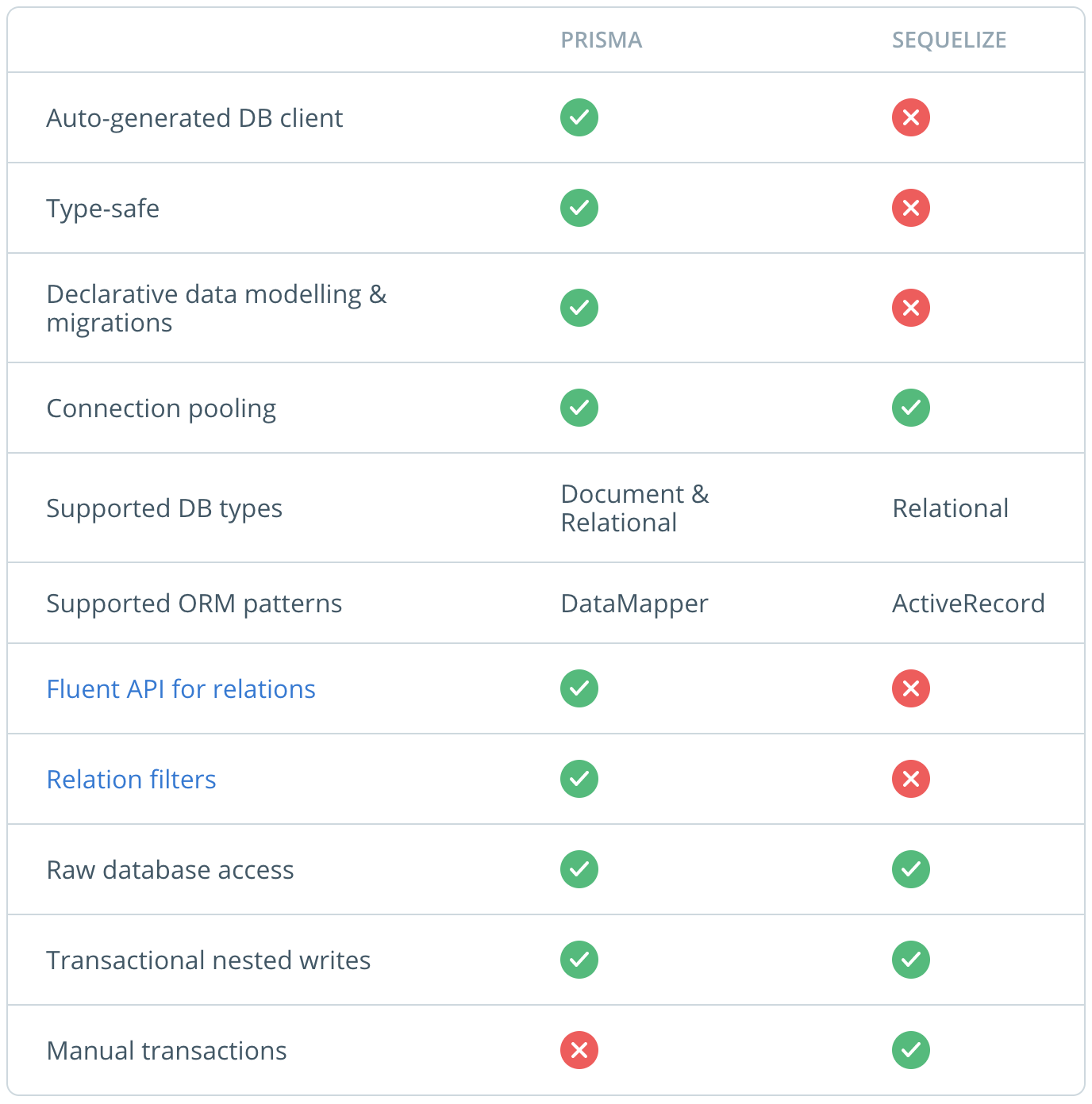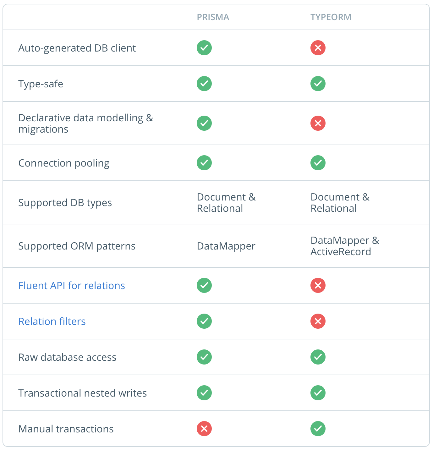 추가로, Prisma 공식 문서의 비교 테이블을 가져와봤어요.
