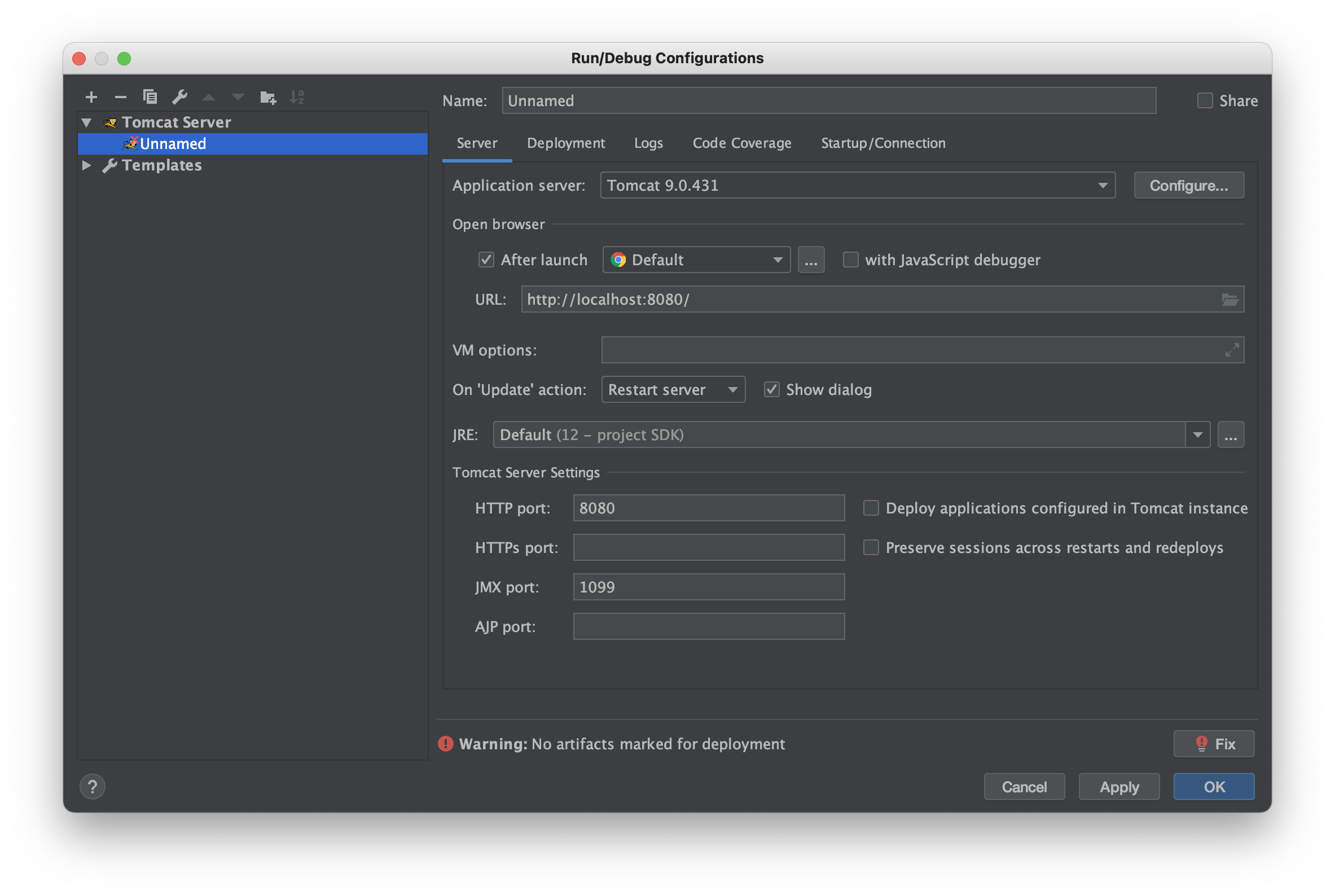 하나 더! 아래를 보면 Warning: No artifacts marked for deployment 라는 경고창이 있어요.