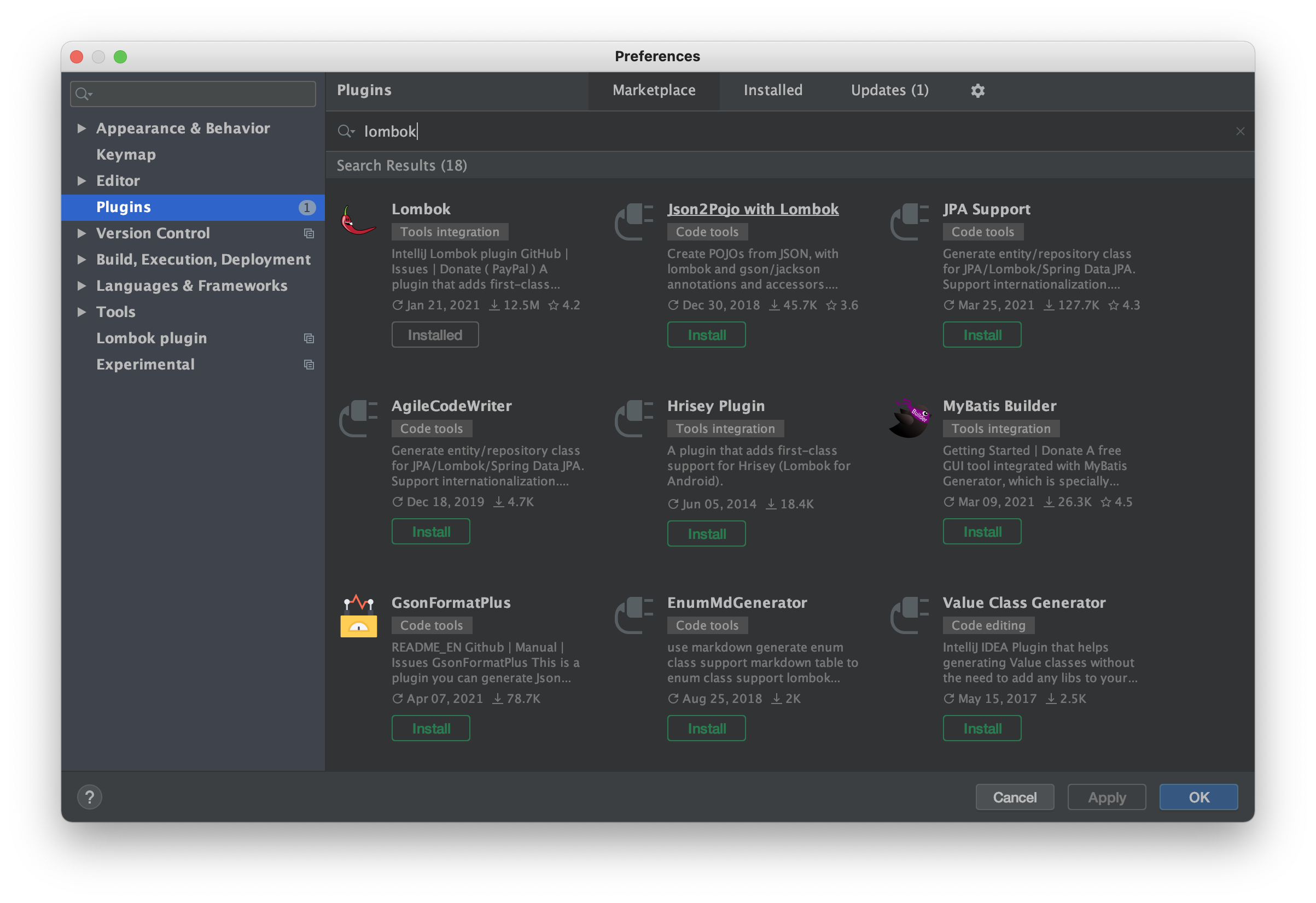 Preferences... 에서 plugin을 선택한 후, Lombok을 검색해서 설치해주세요.