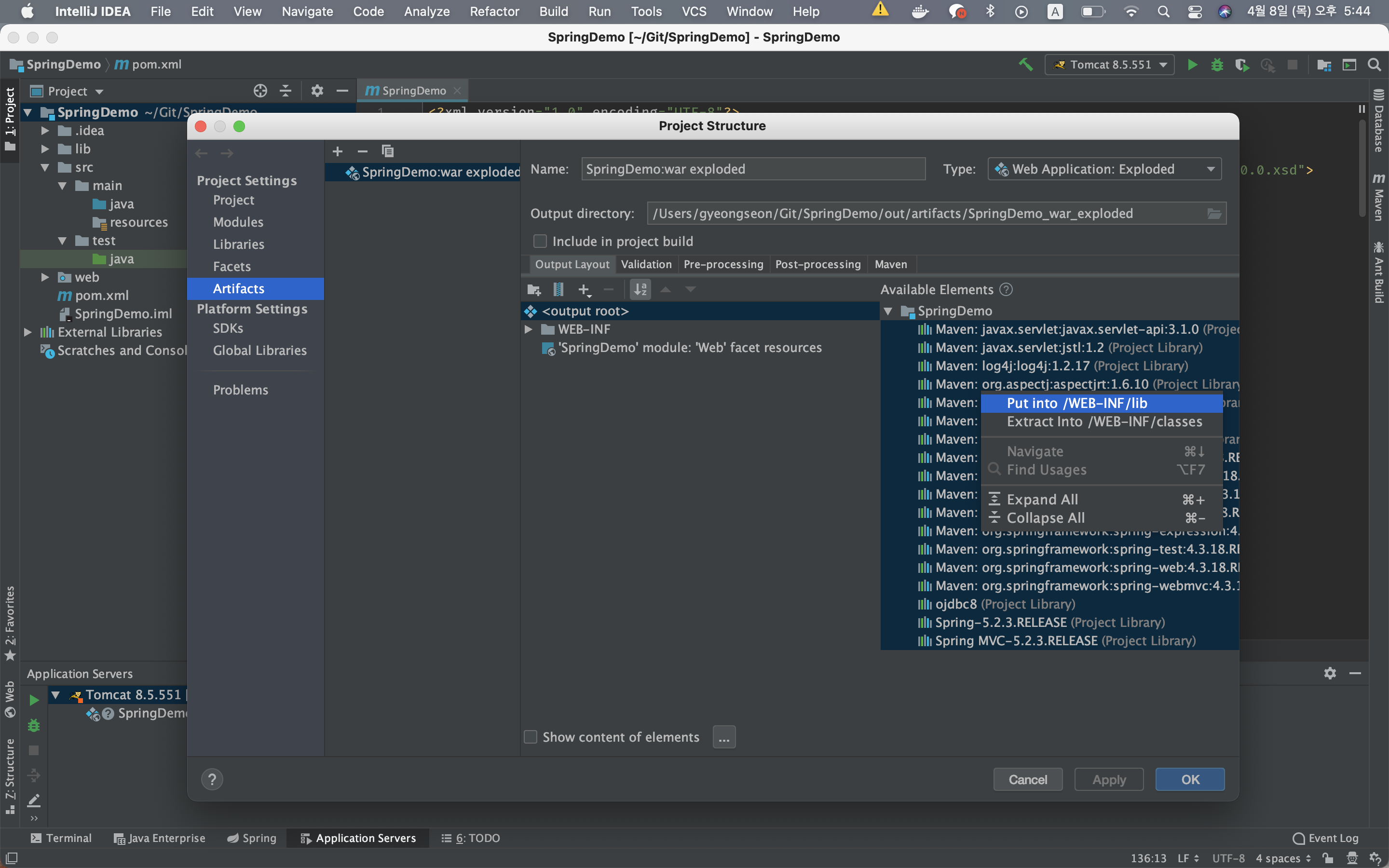 모든 Elements를 선택해서 Put into /WEB-INF/lib 를 선택해줍니다.